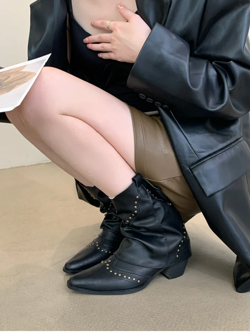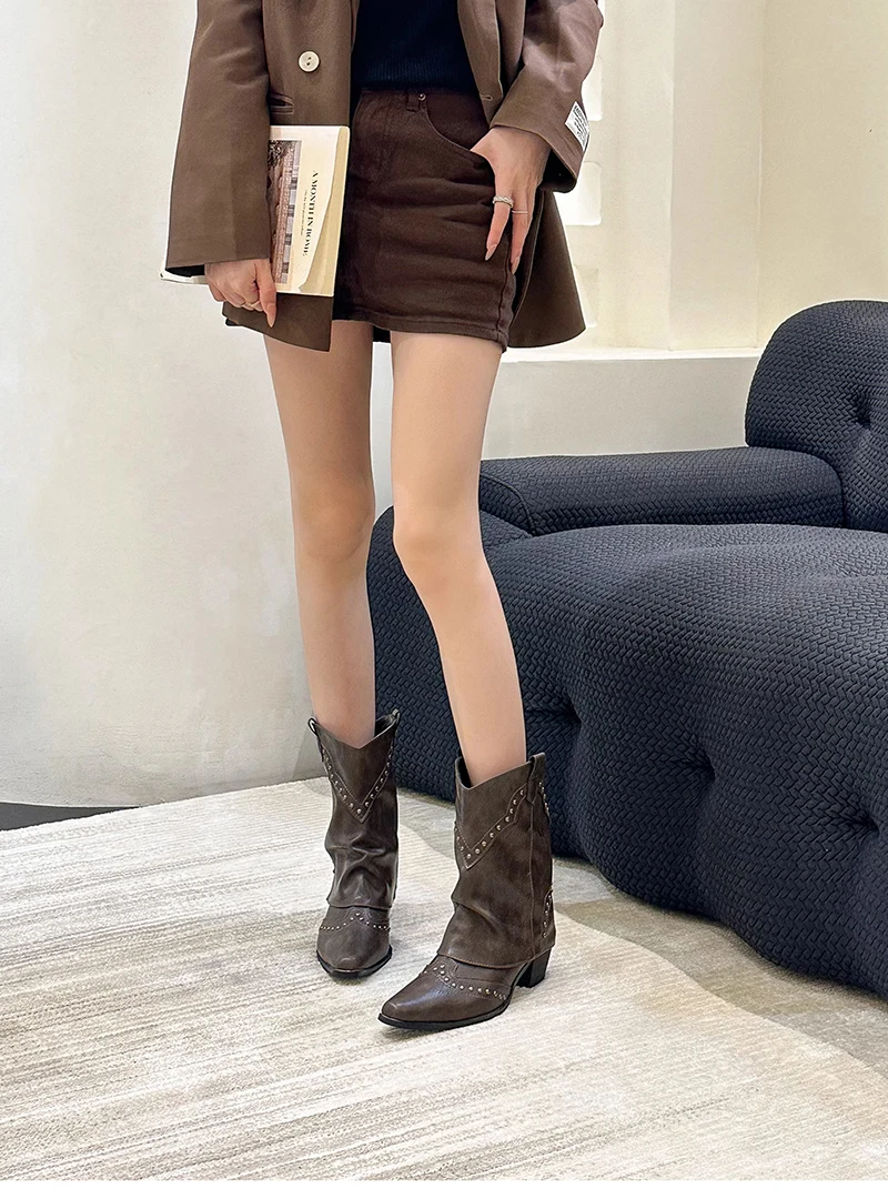 LBSFY - Woman Cowgirl Boots Fashion Slip On Ladies Elegant Square Heel Short Boots Shoes Retro Women's Winter Footwear