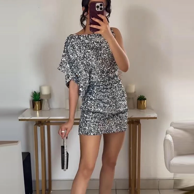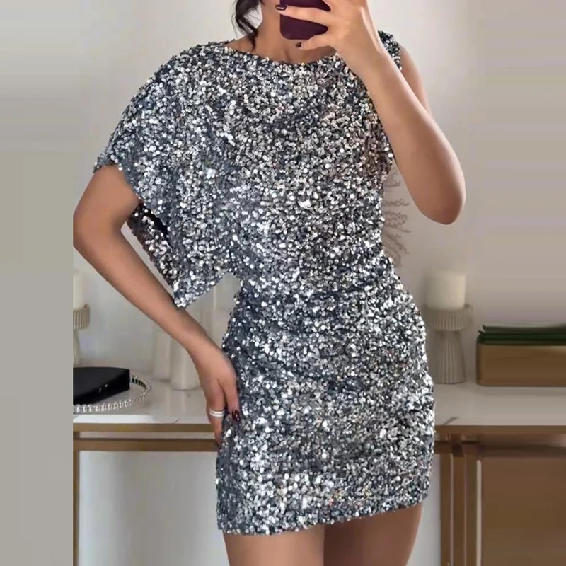 LBSFY - Women 2025 One Shoulder Short Sleeve Club Dress Elegant O-Neck Sequin French Style Glitter Dress Spring Temperament Party Dress