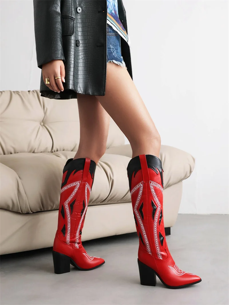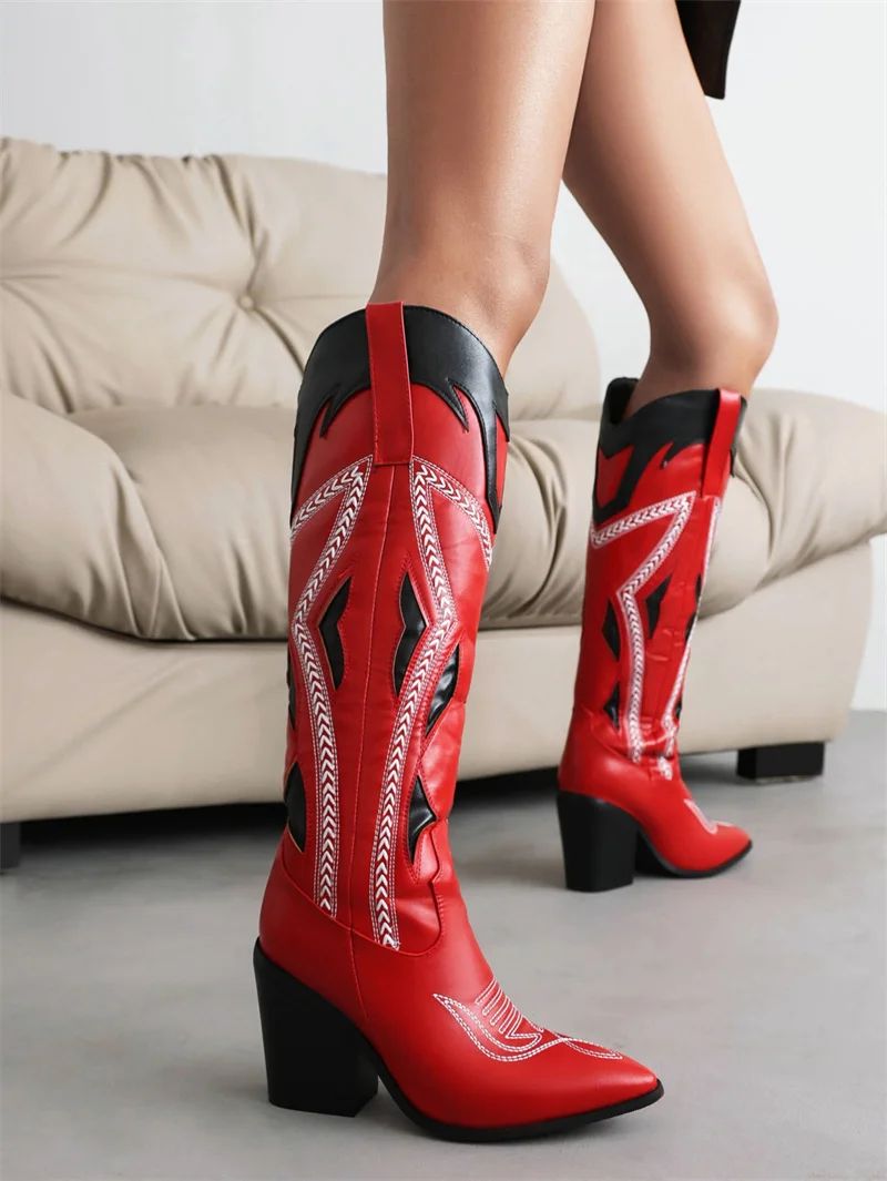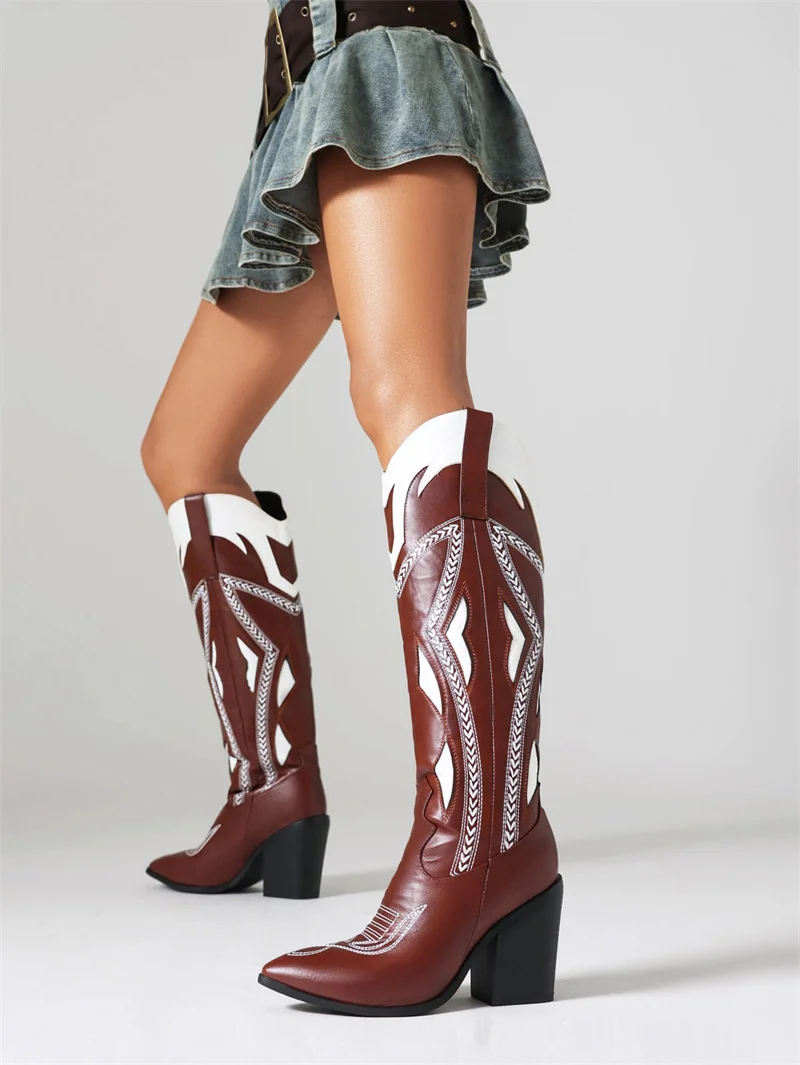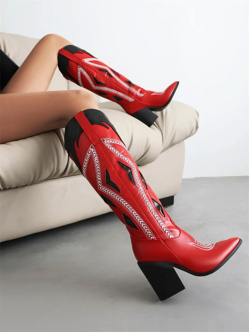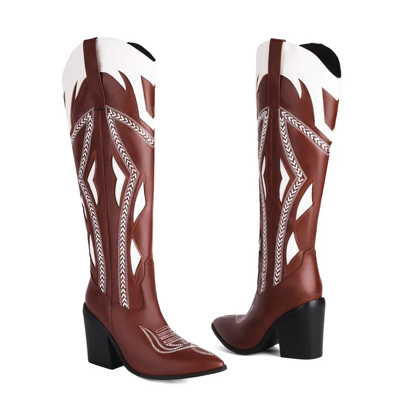 LBSFY - Women Cowboy Boots Western Knee High Block Heel Plus Size 43 Cowgirl Shoes