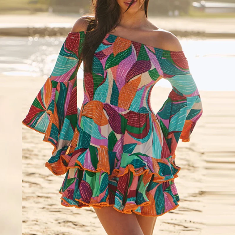 LBSFY - Women Elegant Flower Print Draped A-Line Dress Causal Flare Sleeve Bohemian Party Dress Sexy Slash Neck HIght Waist Mini Dresses