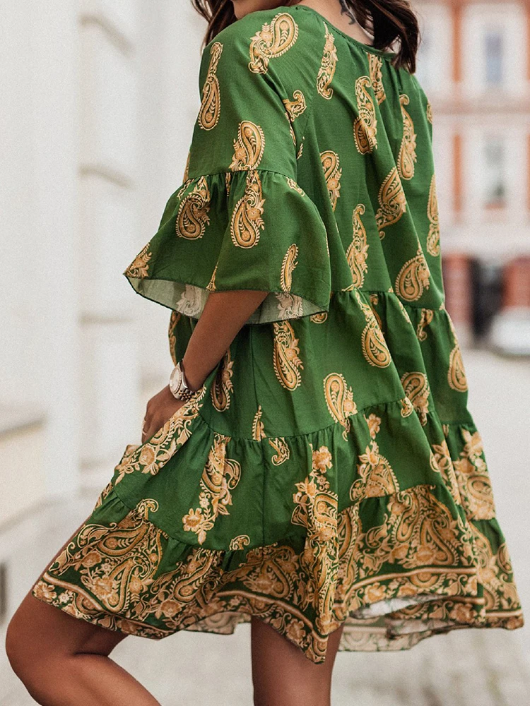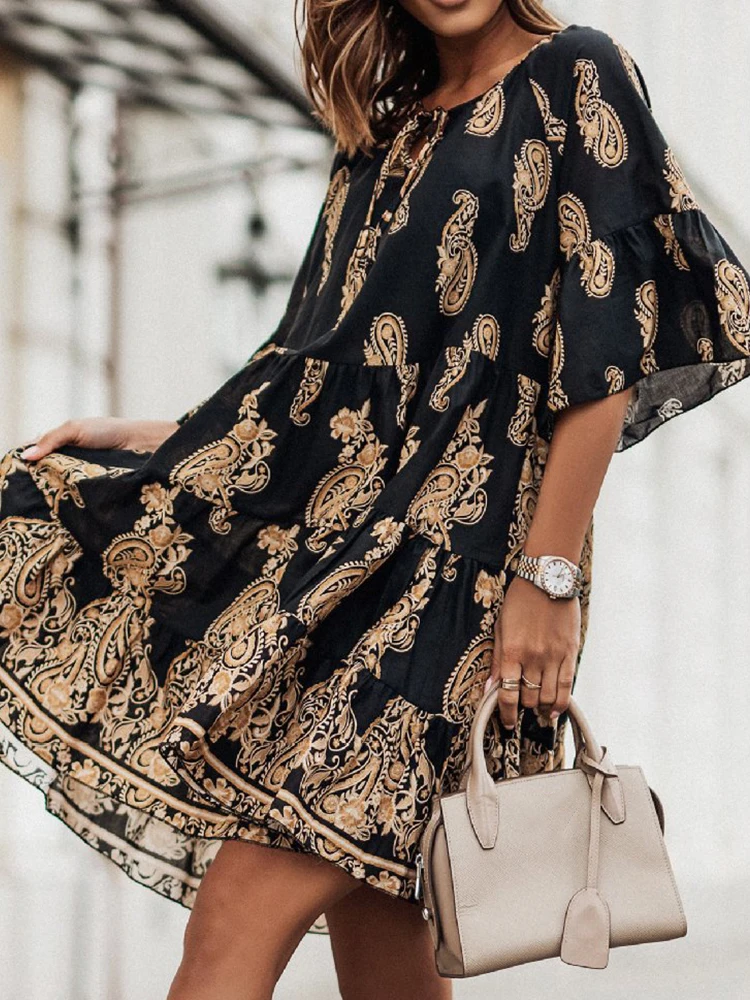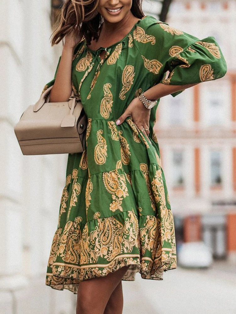 LBSFY - Women Fashion O Neck Button Shirt Dress Office Elegant Pattern Printed Party Dress Summer Casual Short Sleeve Bohe Long Dresses