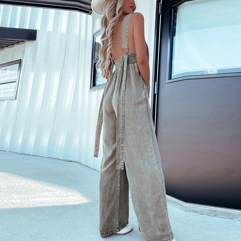 LBSFY  -  Women Fashion Pleated Solid Color Long Jumpsuit 2025 Casual Pocket Wide Legger Playsuits Elegant V-neck Sleeveless Denim Romper