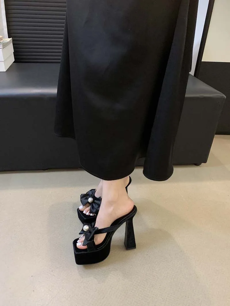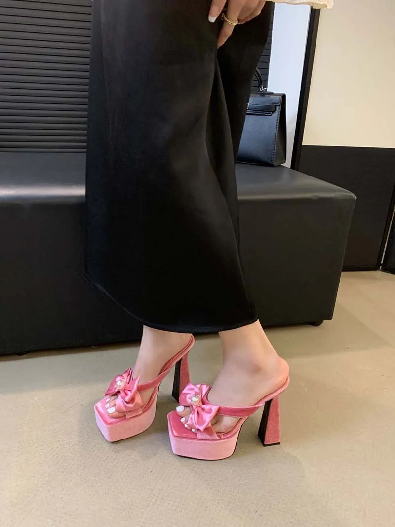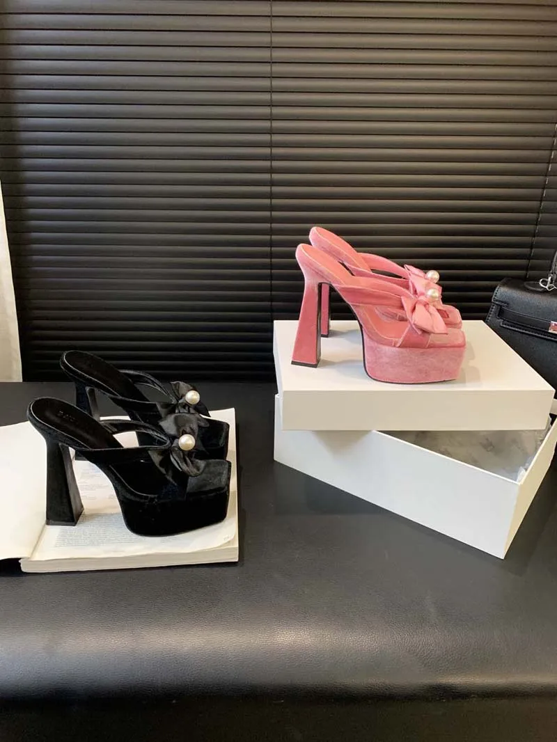 LBSFY - Women High Heels Slippers Pink Bow Pearl Sandals Women Chunky Platform Sexy Summer Shoes Black Suede Slippers Vrouwen 2024