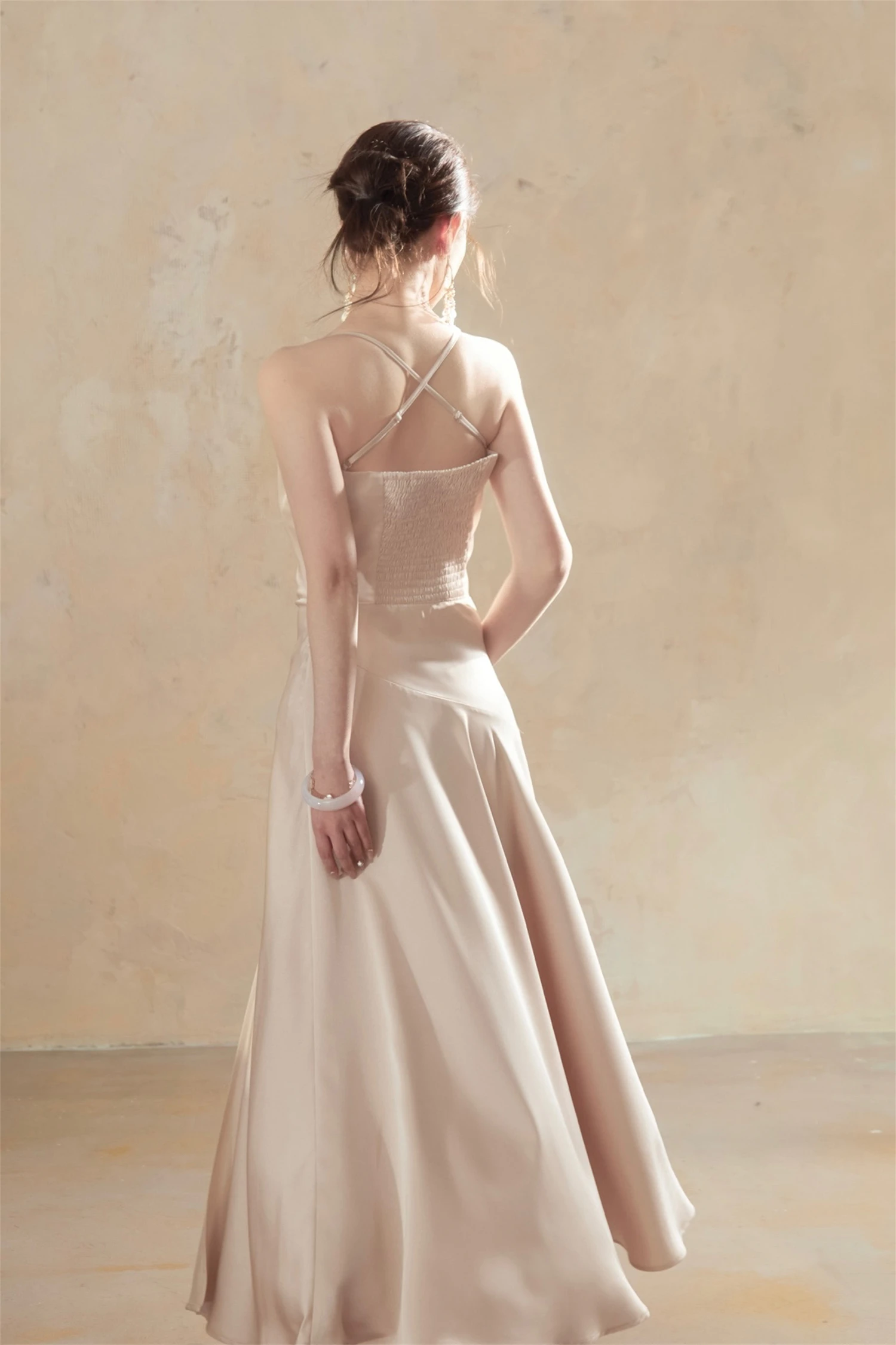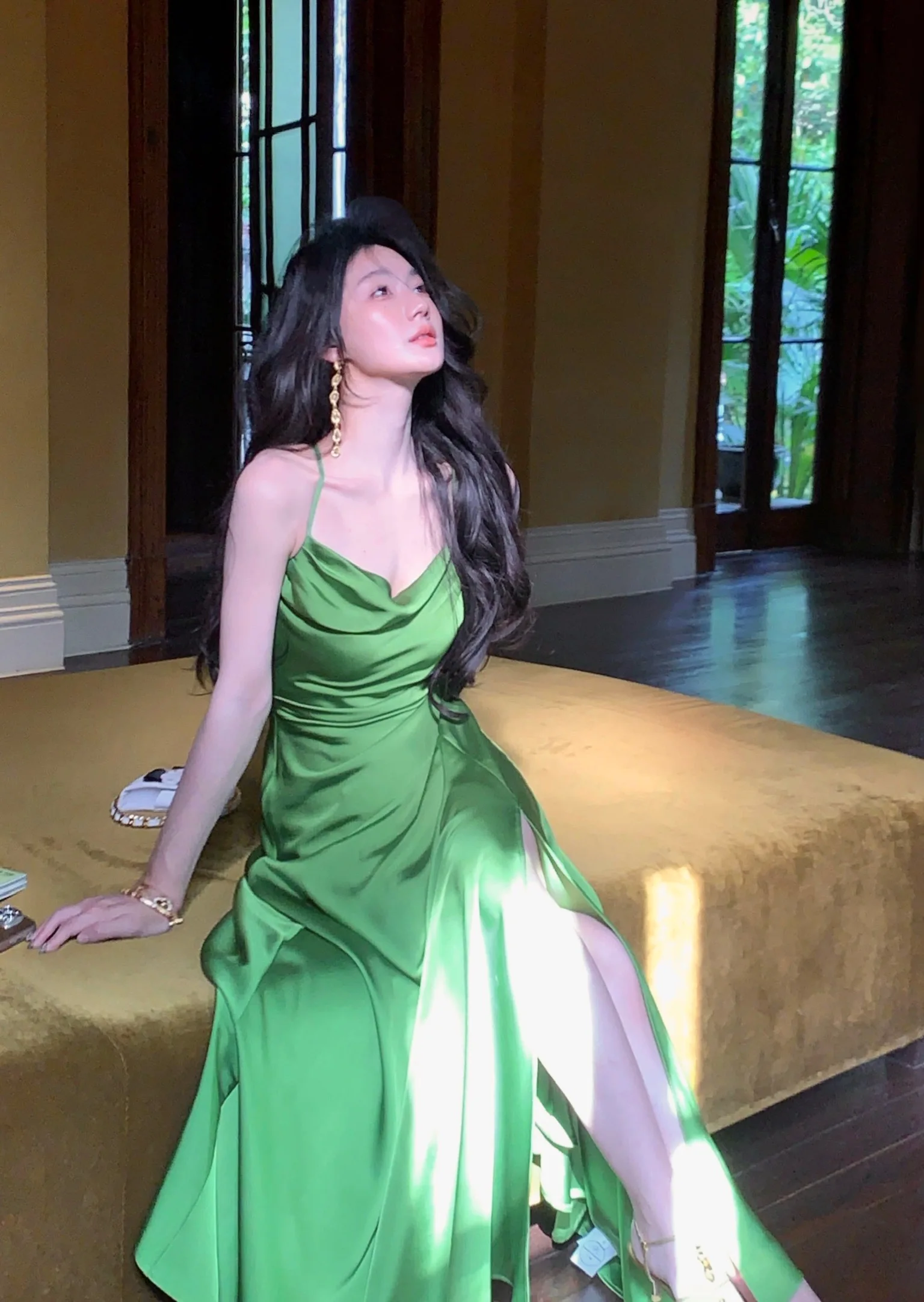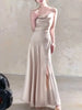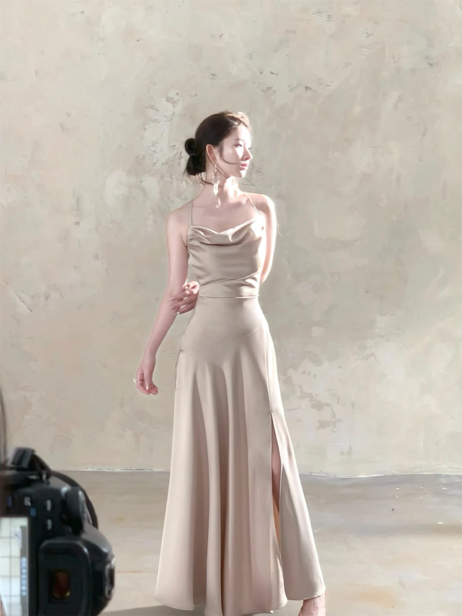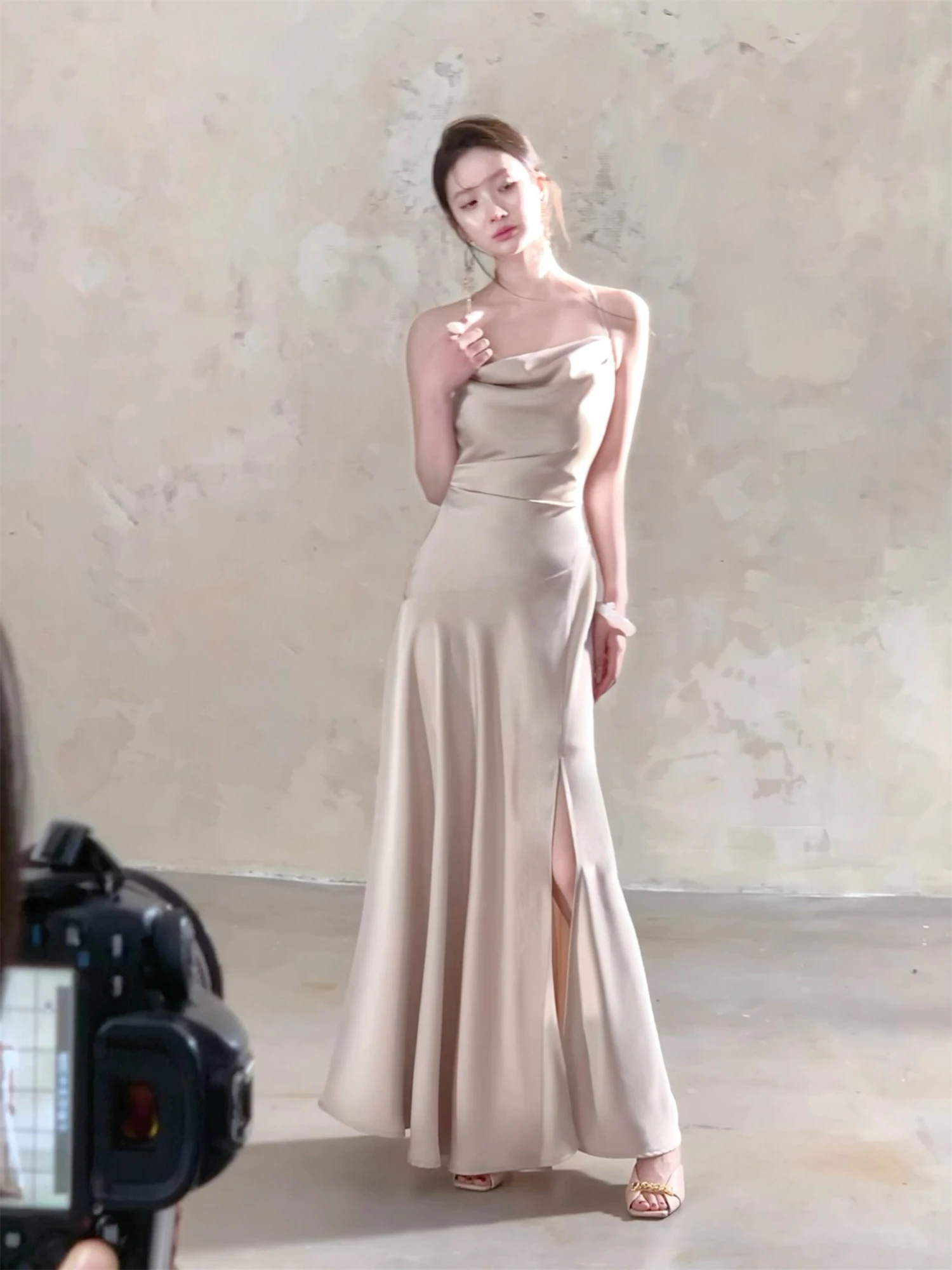 LBSFY -Women Sexy Party Elegant Pleated Dress 2025 French New Fashion Vacation Evening Solid Satin Split Sleeveless Long Dress Summer