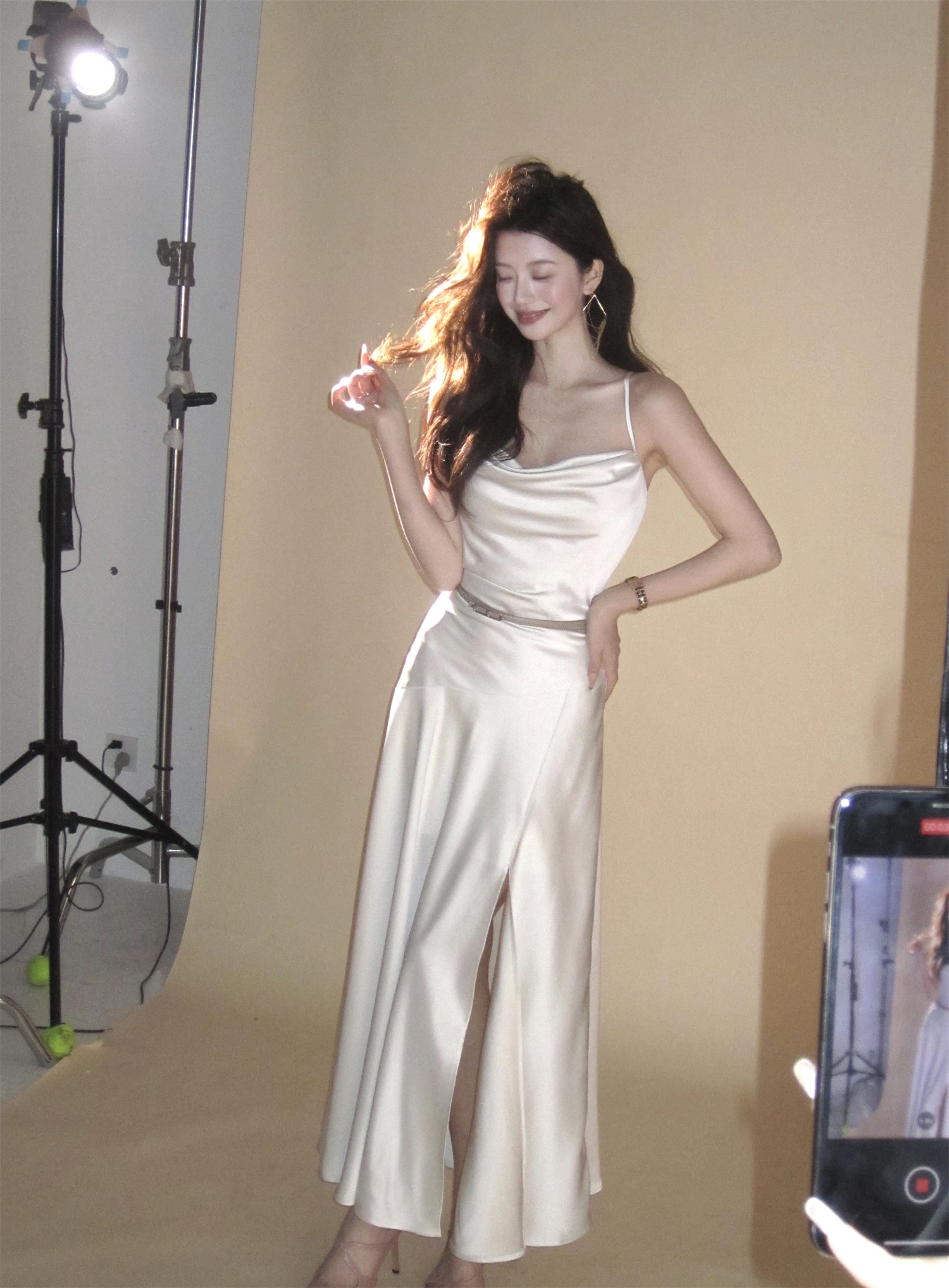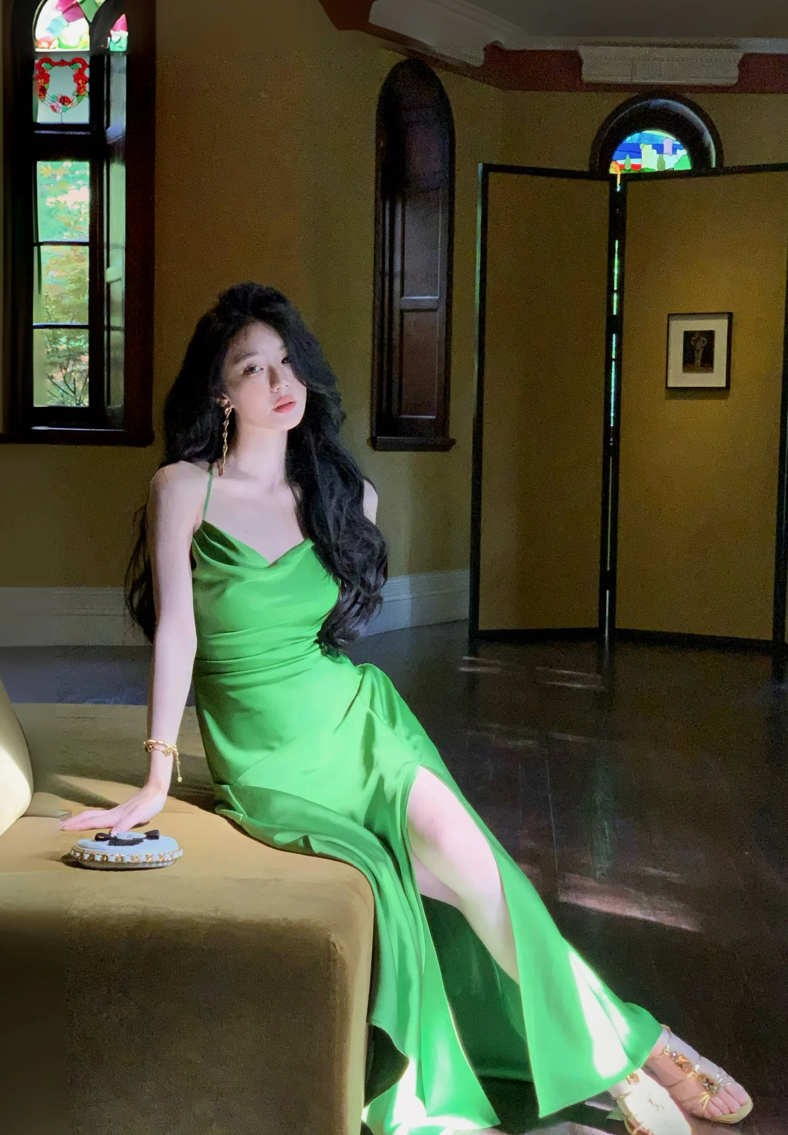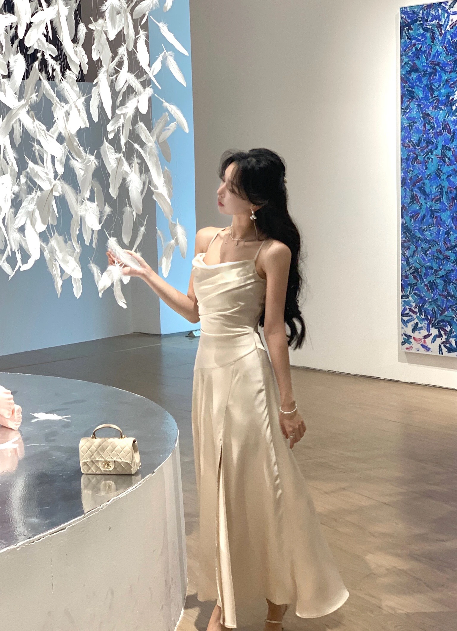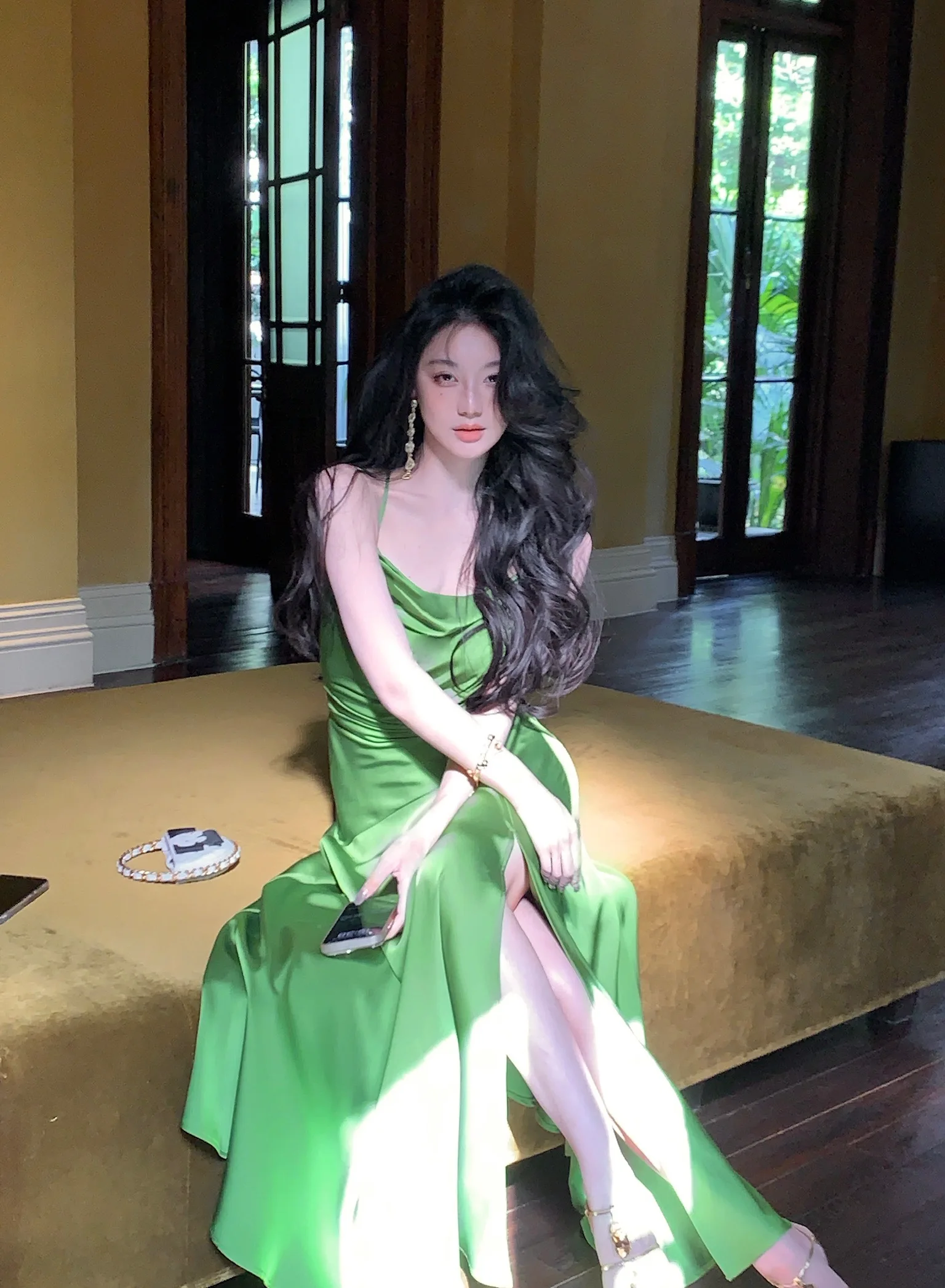 LBSFY -Women Sexy Party Elegant Pleated Dress 2025 French New Fashion Vacation Evening Solid Satin Split Sleeveless Long Dress Summer