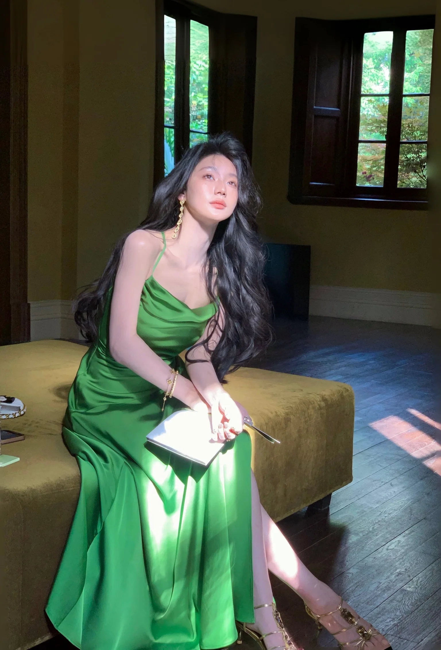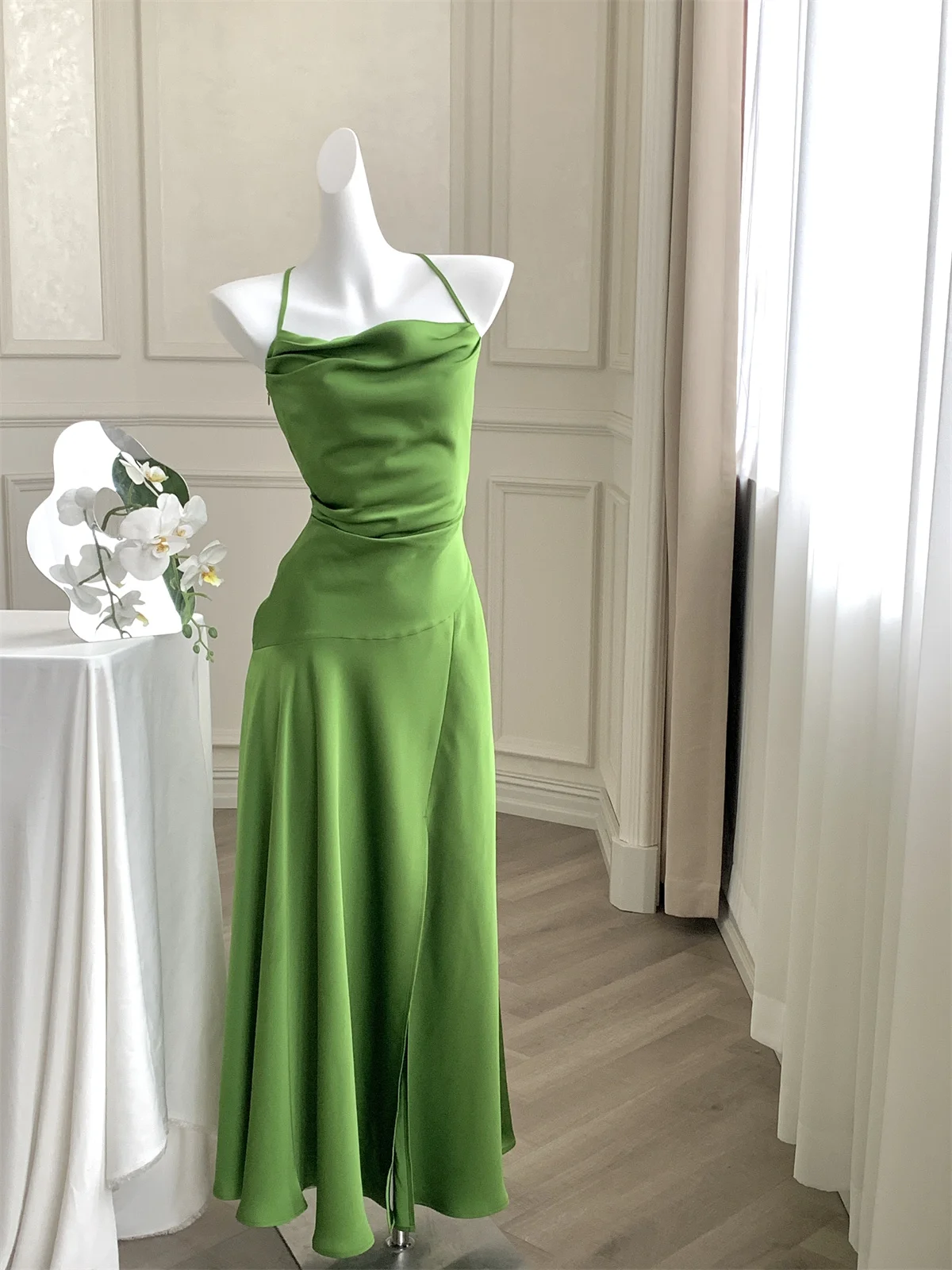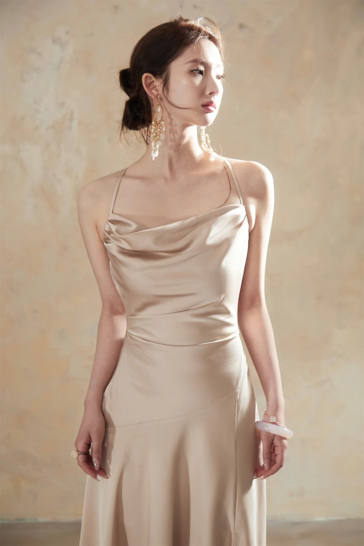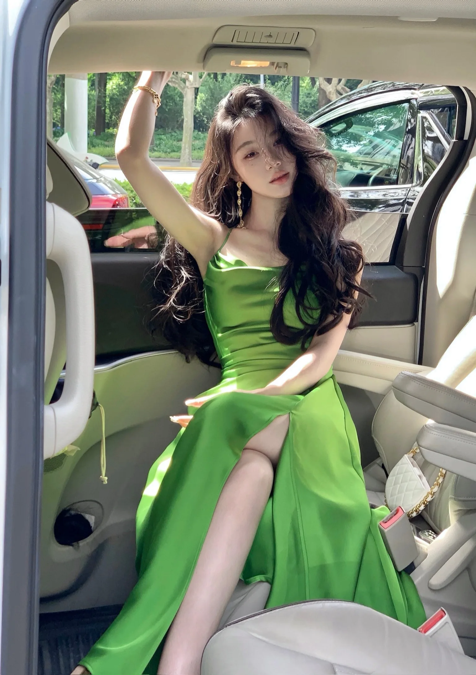 LBSFY -Women Sexy Party Elegant Pleated Dress 2025 French New Fashion Vacation Evening Solid Satin Split Sleeveless Long Dress Summer