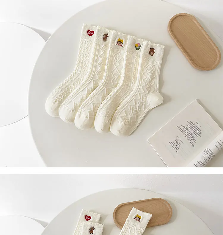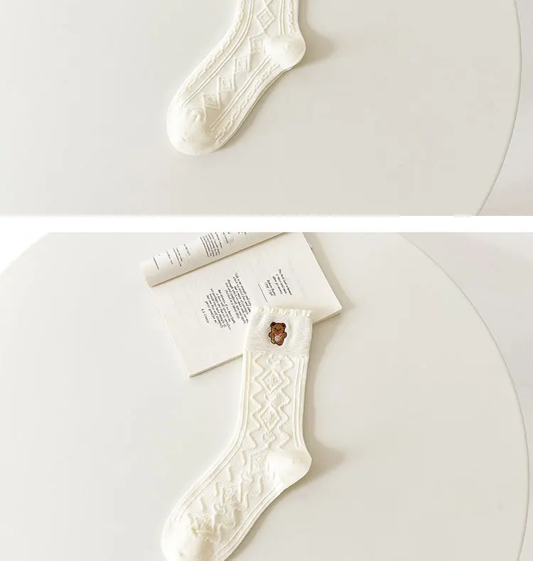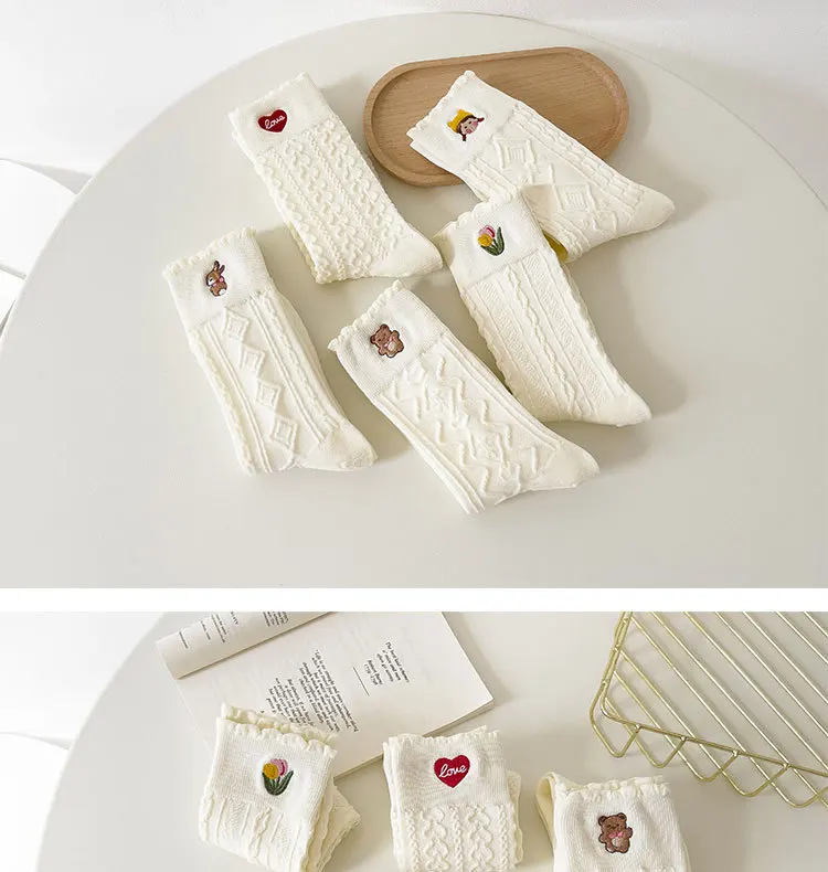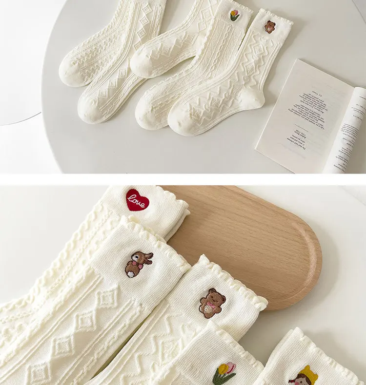 Lbsfy Women Socks Cartoon Bear Love Embroidery Female Lovely Cute Kawaii Lolita Cotton Socks Girls Gift Ladies White Long Stockings