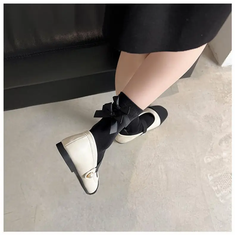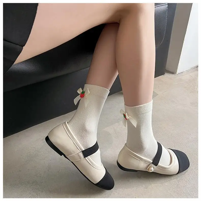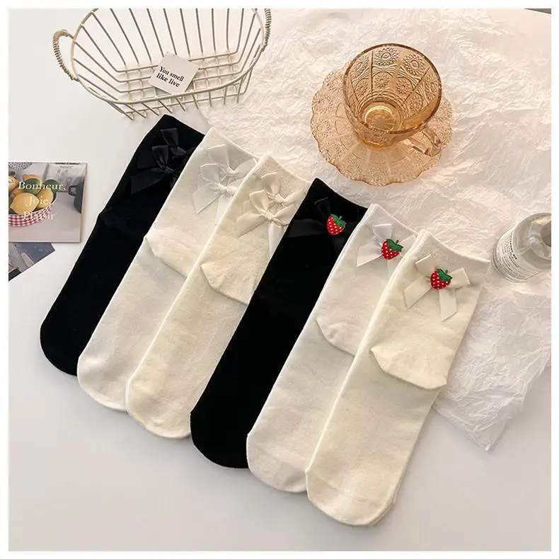 Lbsfy Women Socks Cotto Midtube Socks Black White Solid Color Japanese Harajuku Lolita Style Strawberry Bow Cotton Stockings Girl Gift
