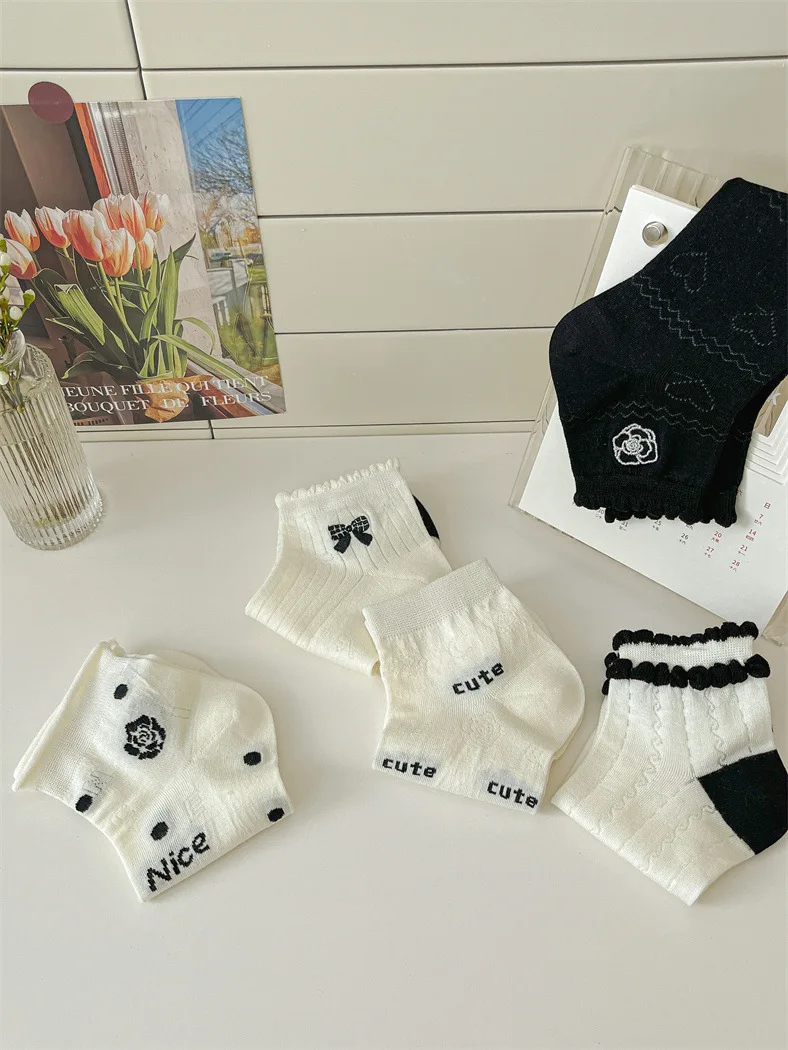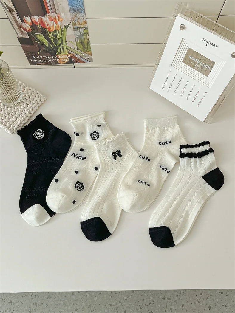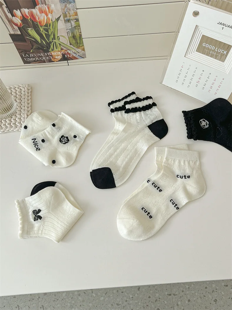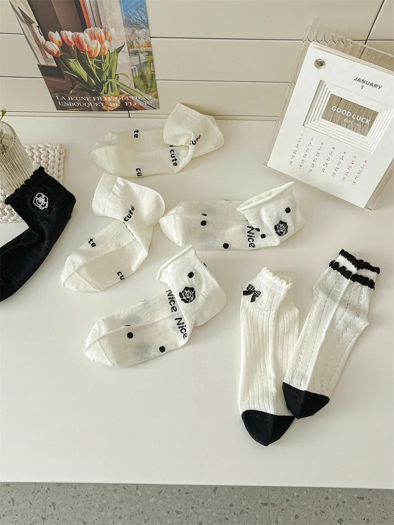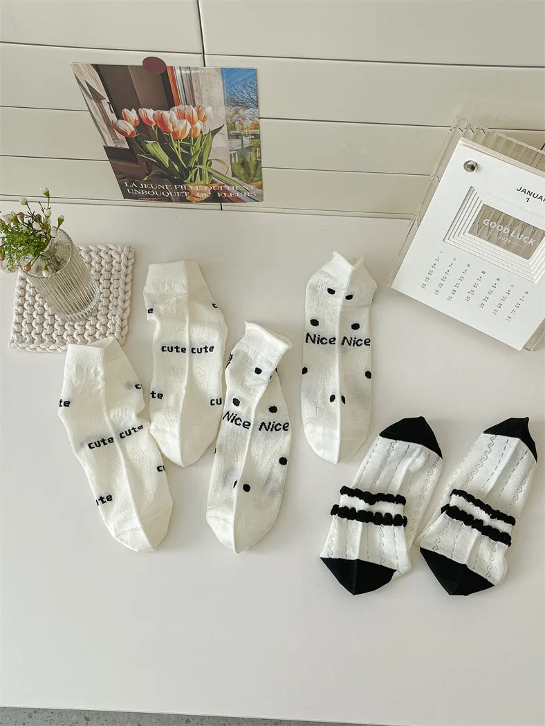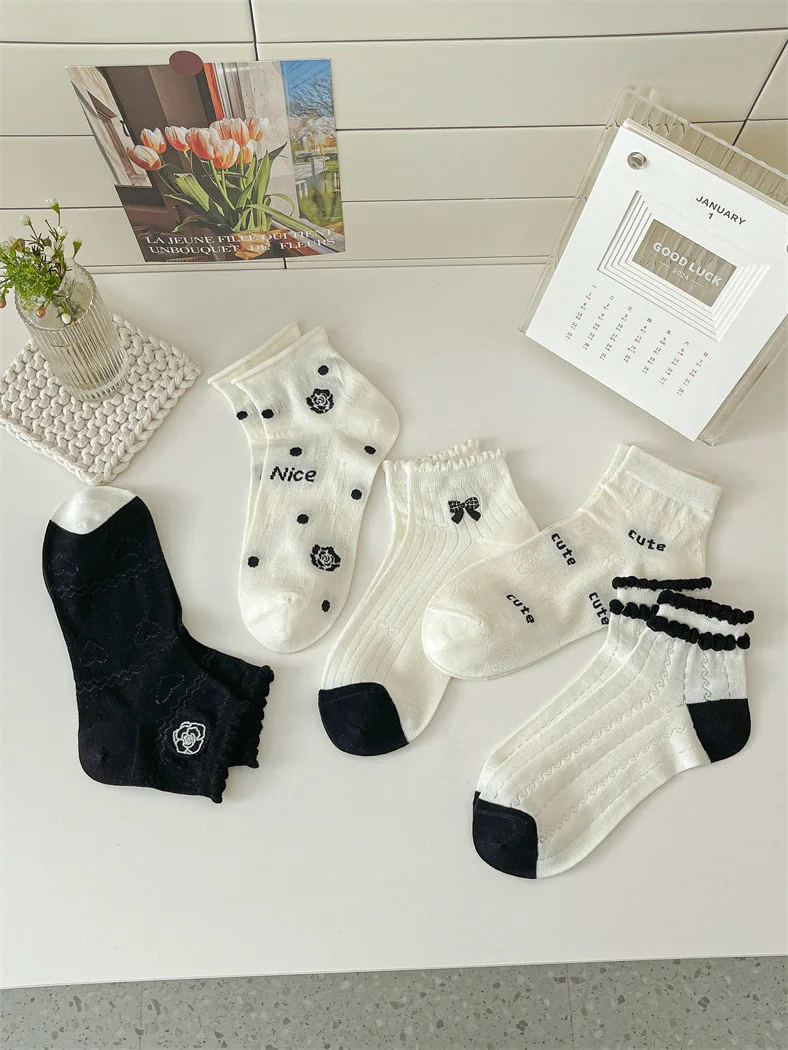 Lbsfy Women's Ankle Socks Spring Summer Black White Fashion Cute Kawaii Lolita Thin Cotton Mesh Breathable Low Tube Socks Calcetines