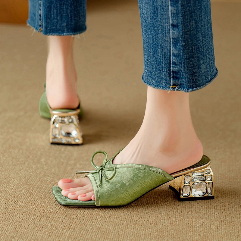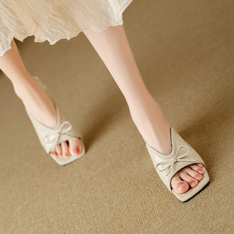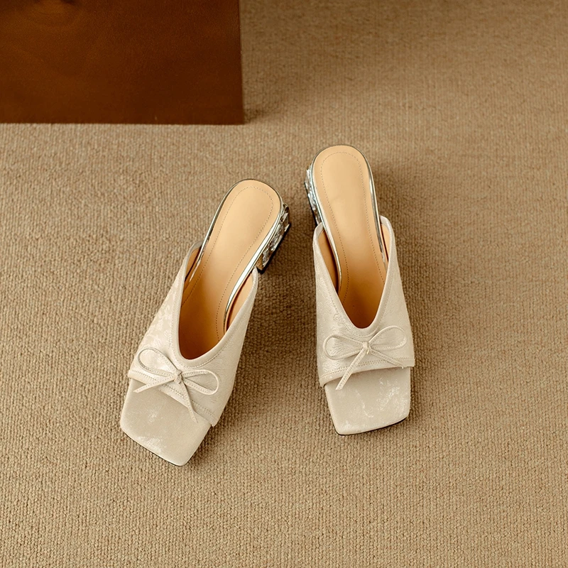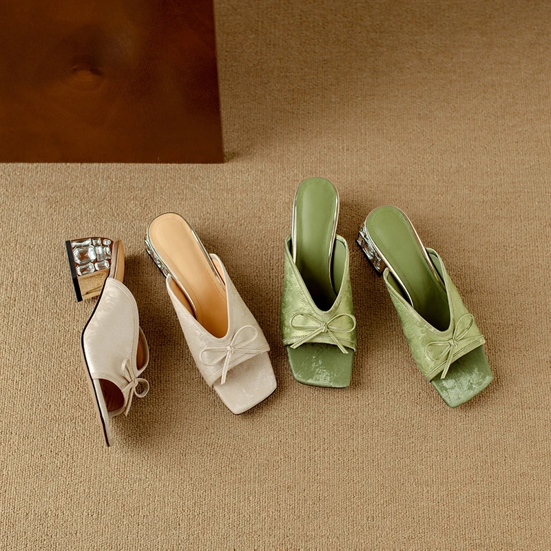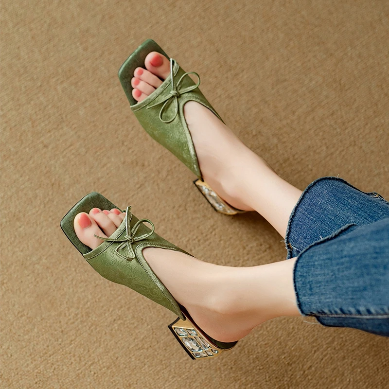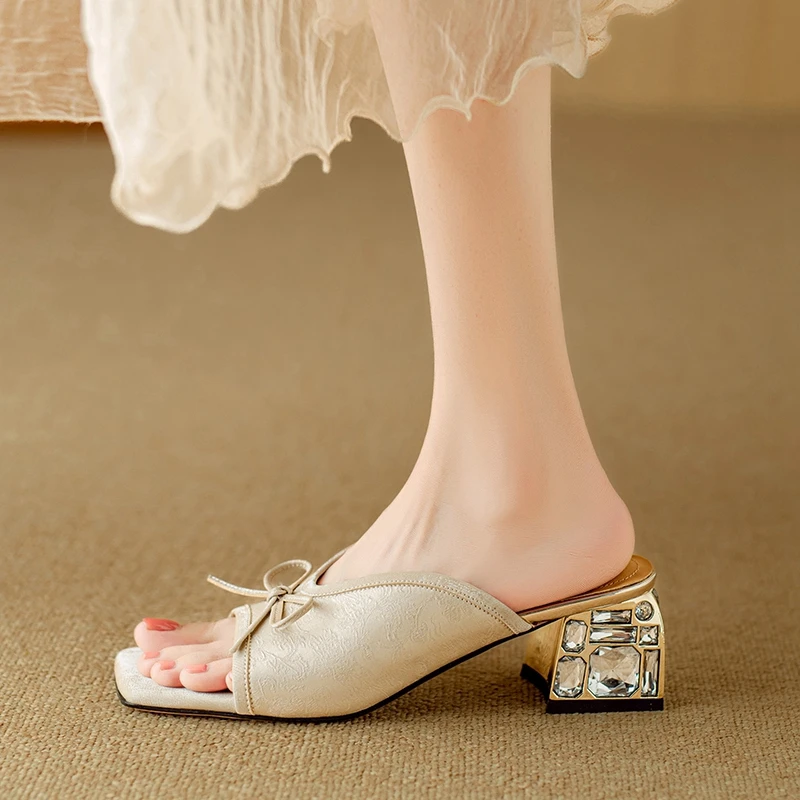 LBSFY - Women's New Spring/Summer Square Headed Genuine Leather Bow Tie with Diamond High Heel Large Open Toe Slippers