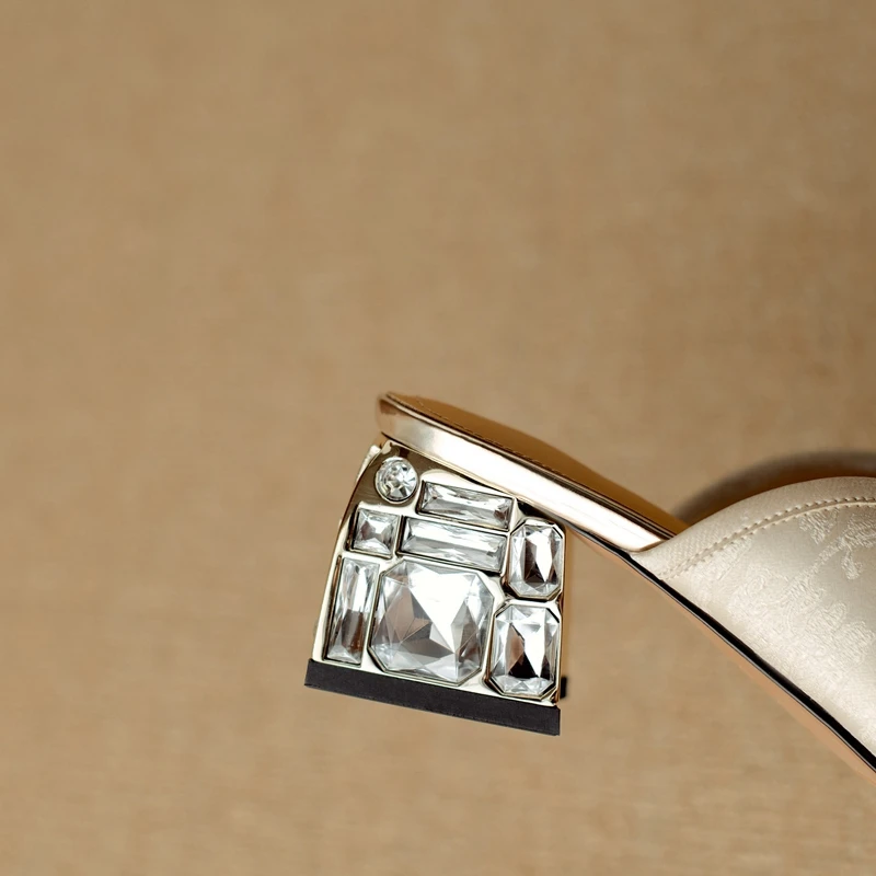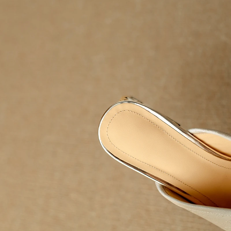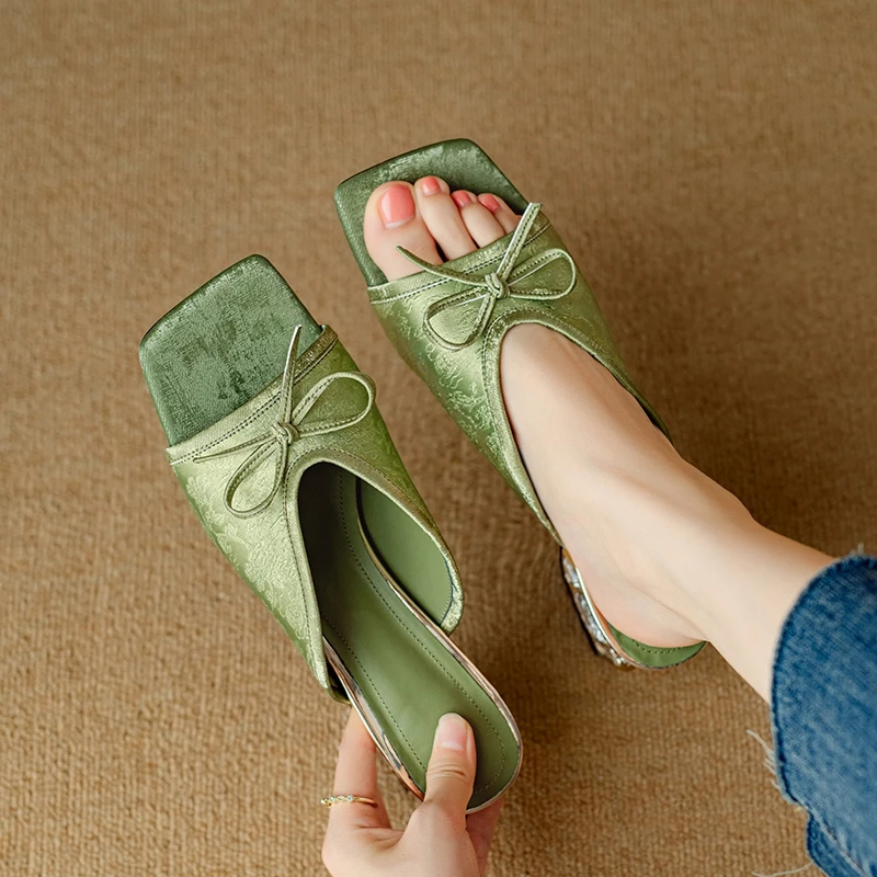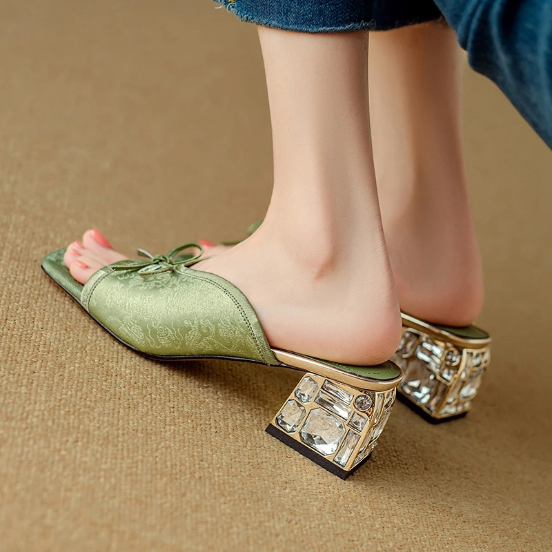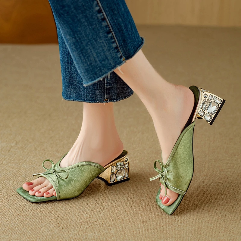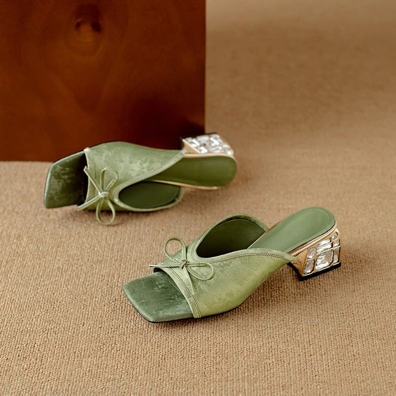 LBSFY - Women's New Spring/Summer Square Headed Genuine Leather Bow Tie with Diamond High Heel Large Open Toe Slippers