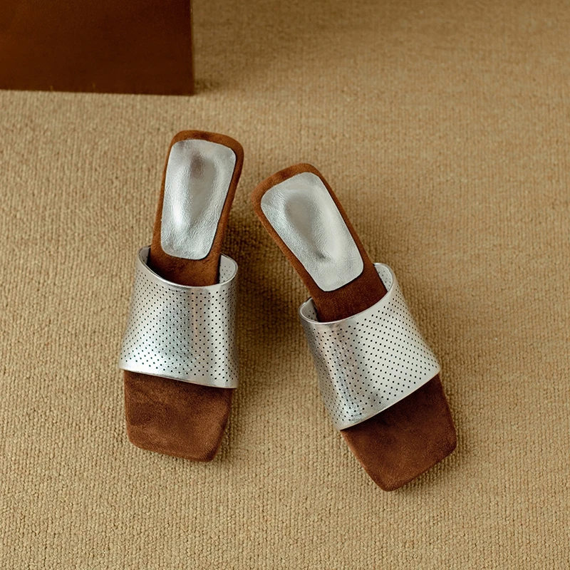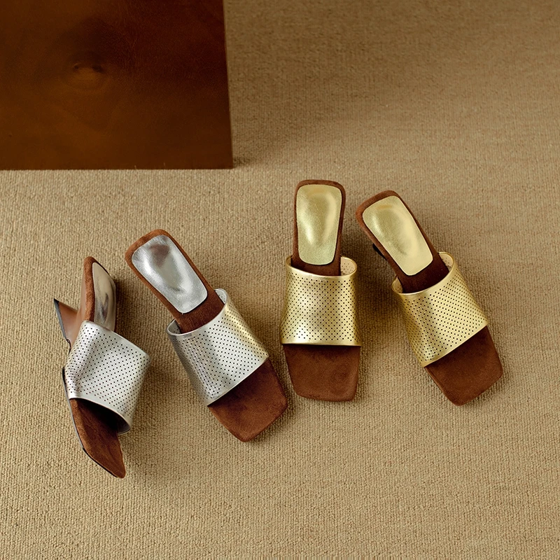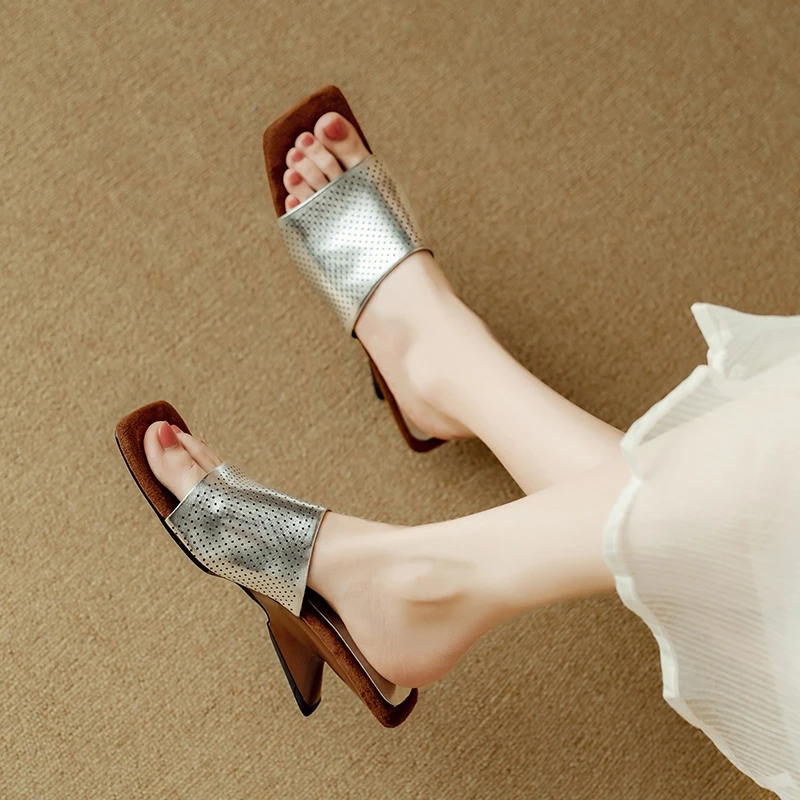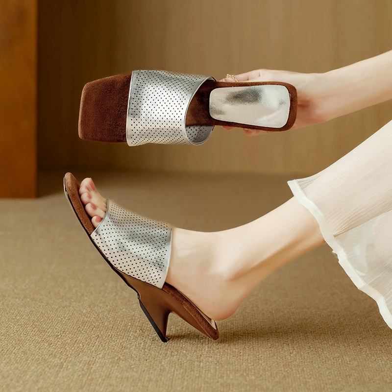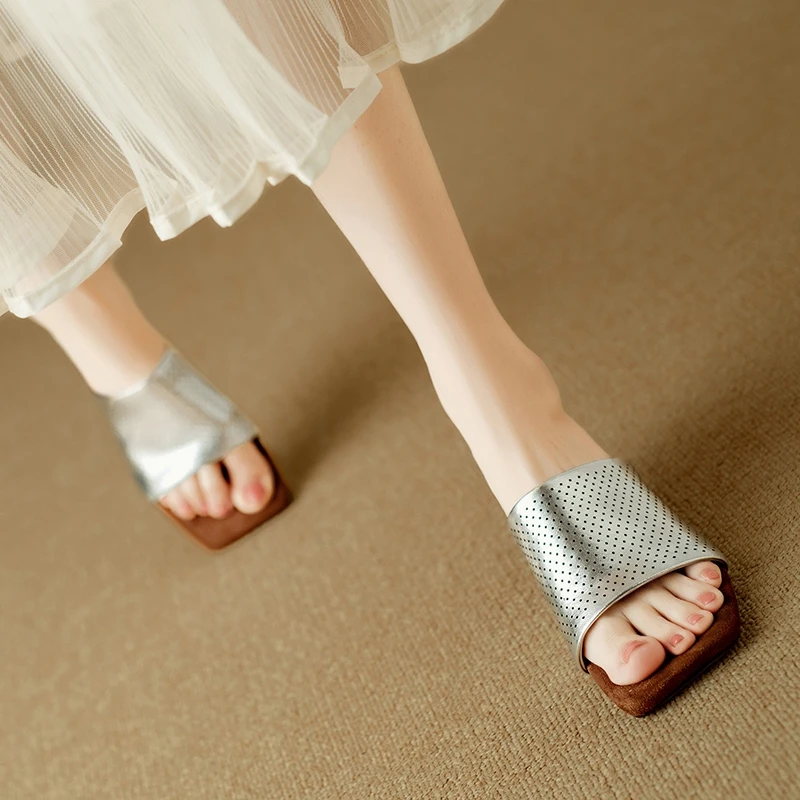 LBSFY - Women's New Spring/Summer Square Headed Leather Cowhide Hollow Hole Breathable Slope Heel Open Toe Middle Heel Slippers