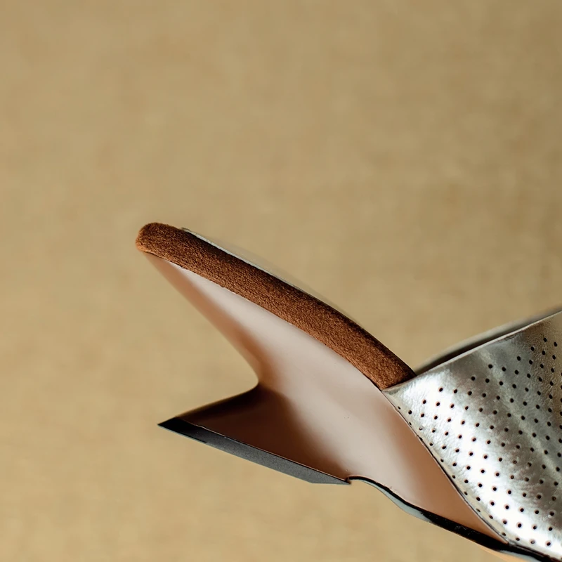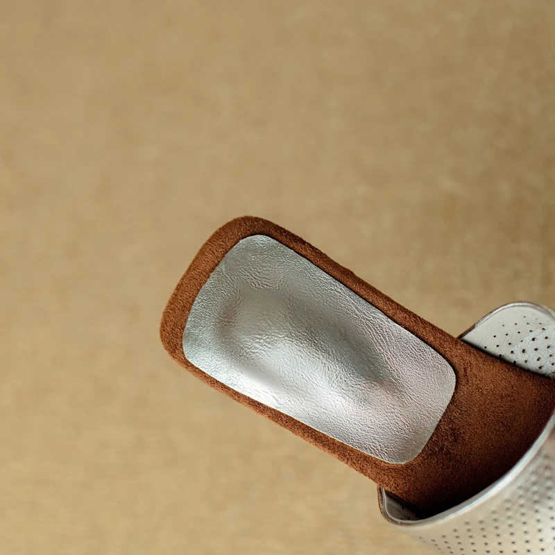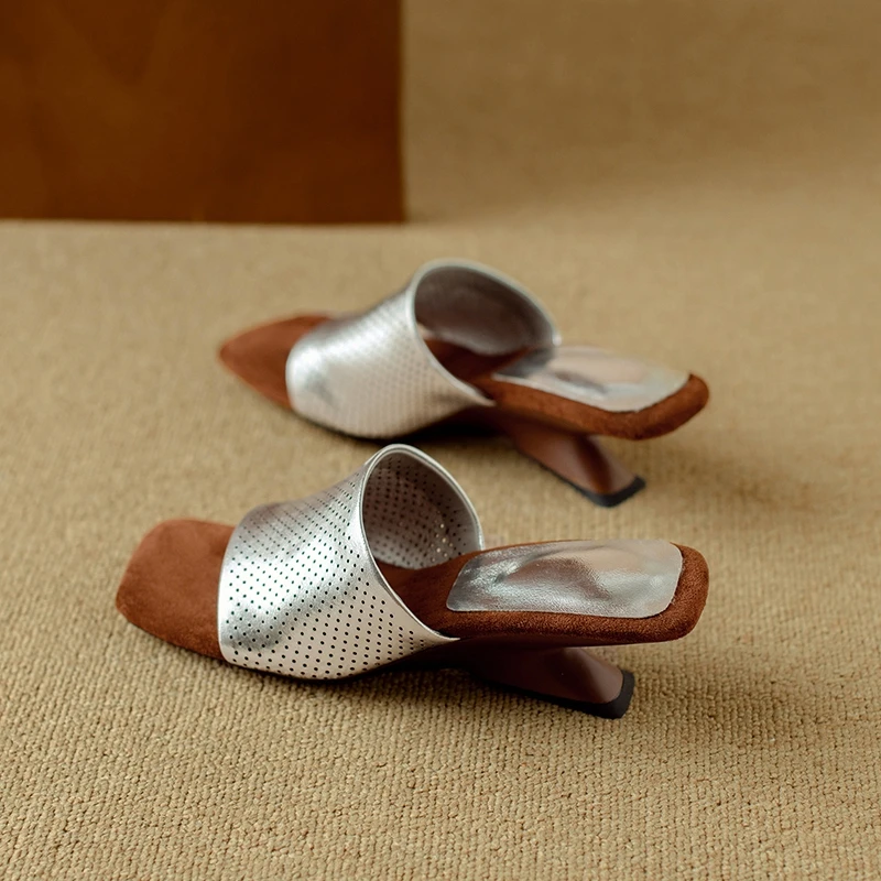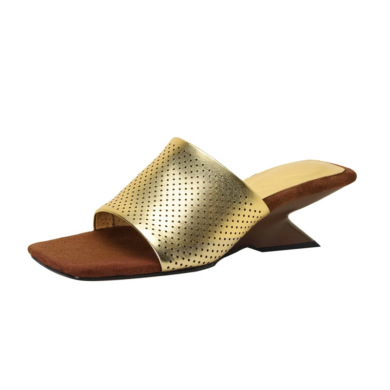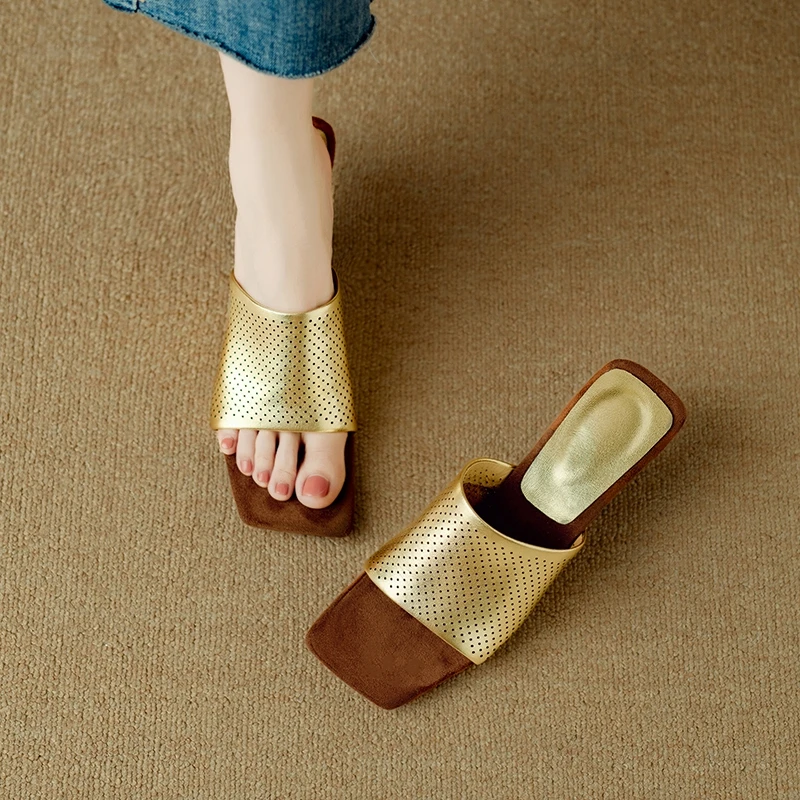LBSFY - Women's New Spring/Summer Square Headed Leather Cowhide Hollow Hole Breathable Slope Heel Open Toe Middle Heel Slippers