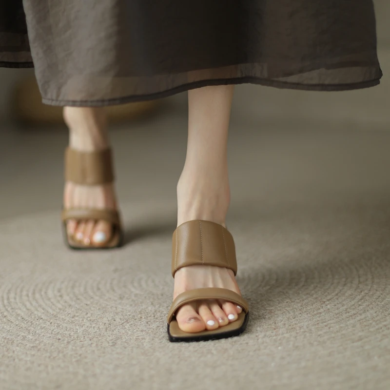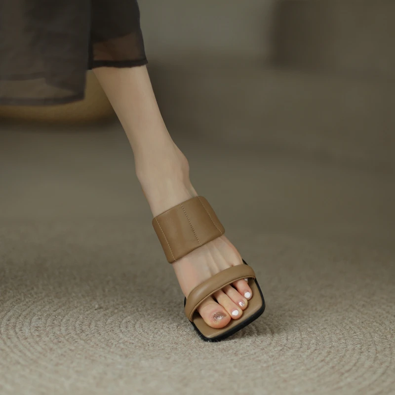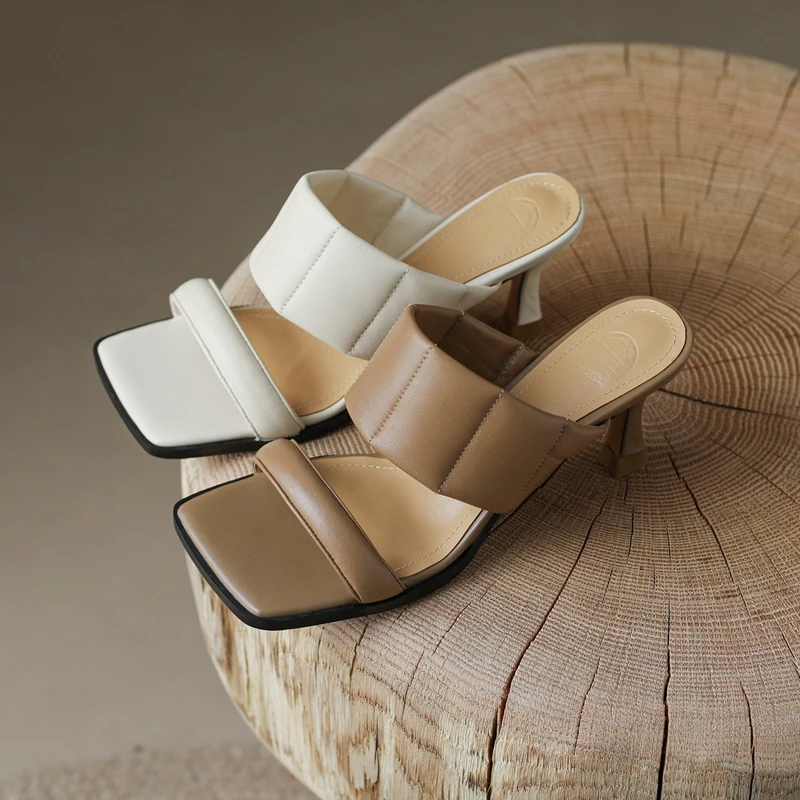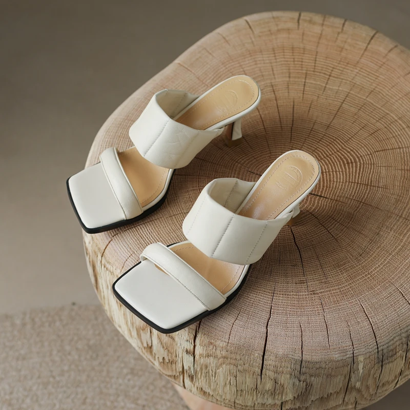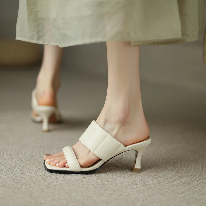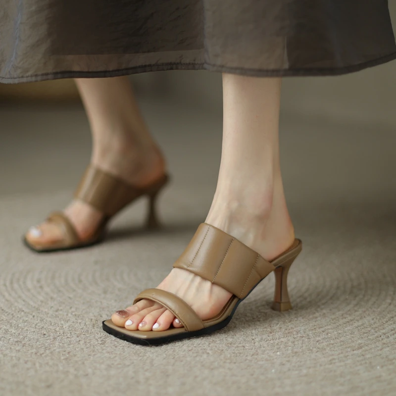 LBSFY - Women's New Summer European and American Leather Sheepskin Embroidered Thread Open Toe High Heel Large Slippers