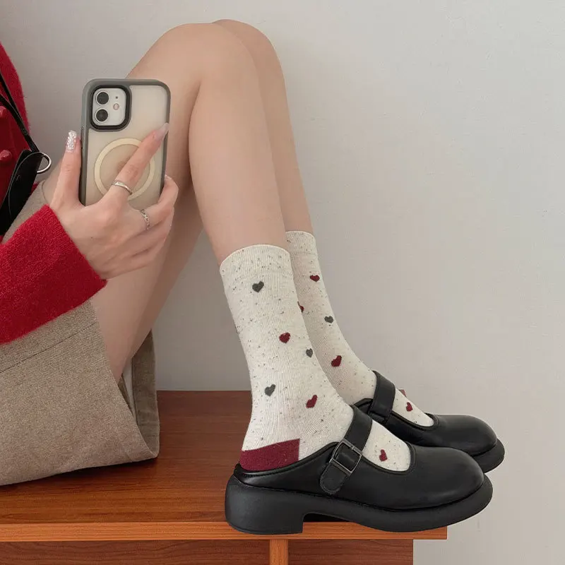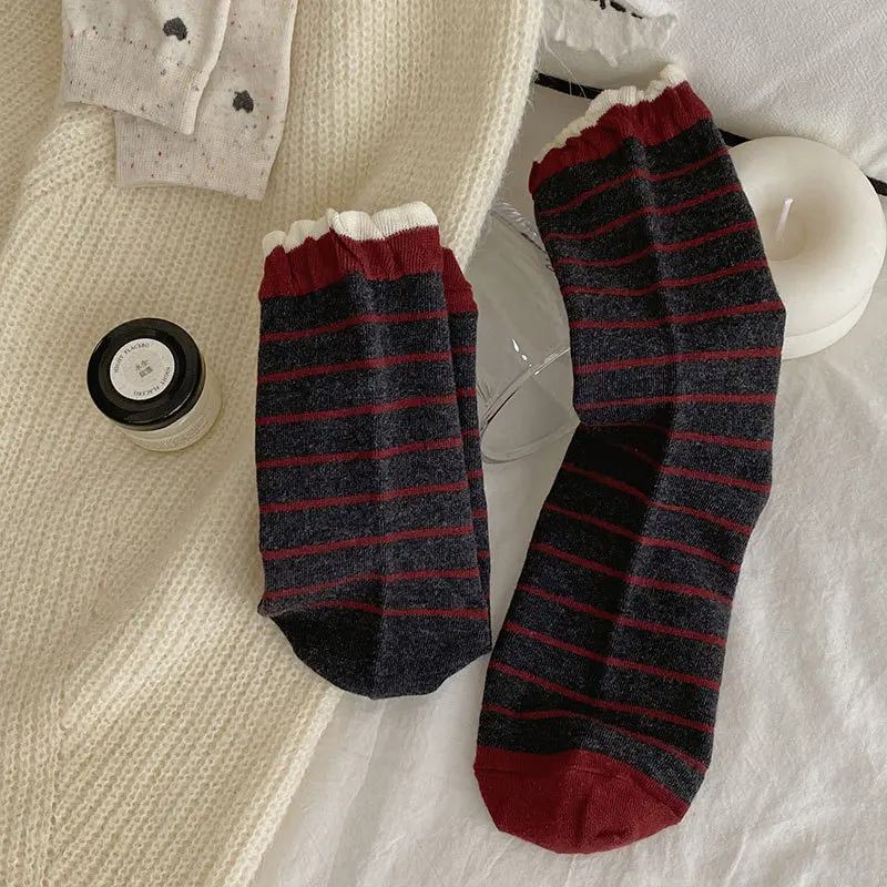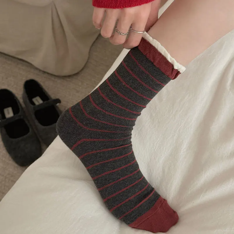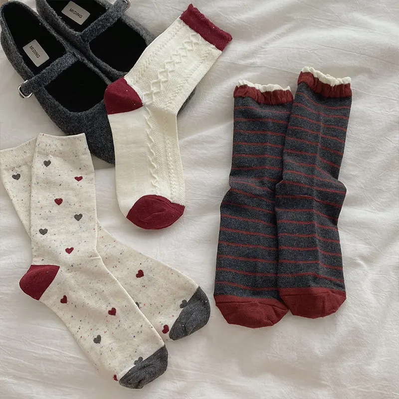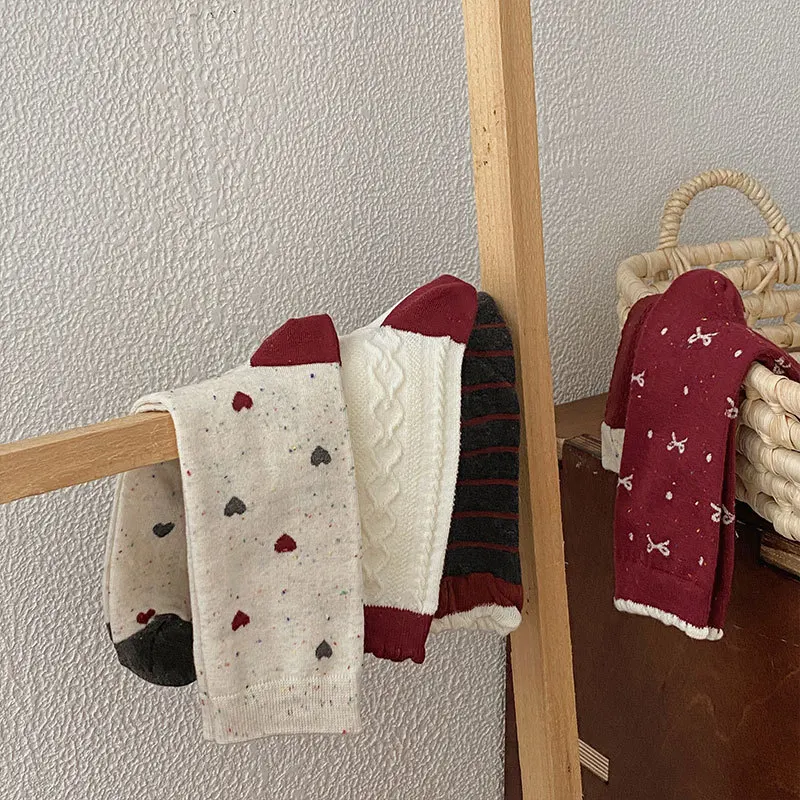 Lbsfy Women's Red Middle Tube Socks Cotton Striped Harajuku Kawaii Casual Socks Fashion Breathable Bowknot Gray Female Socks