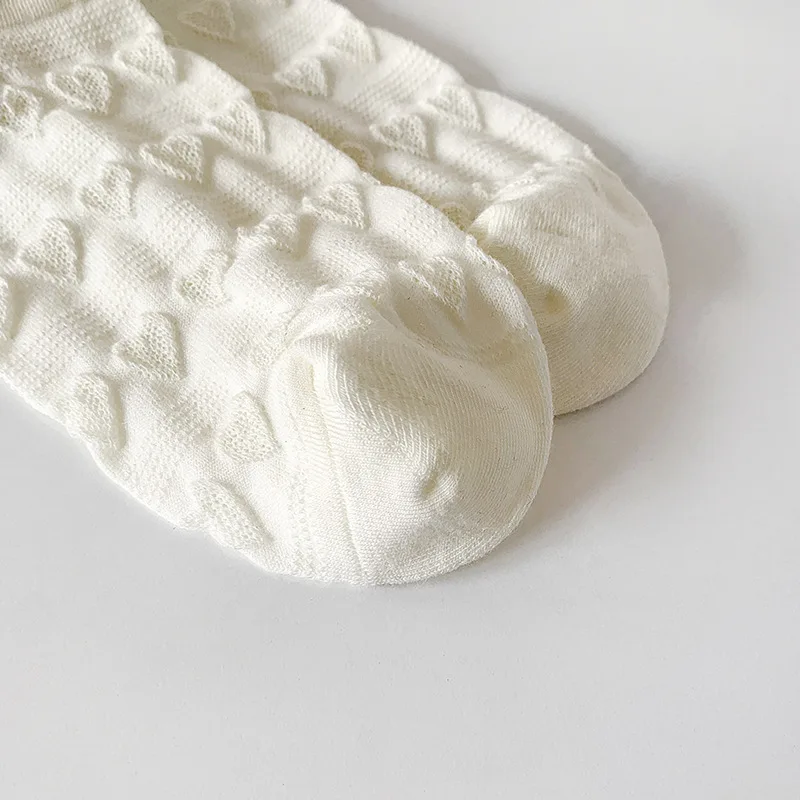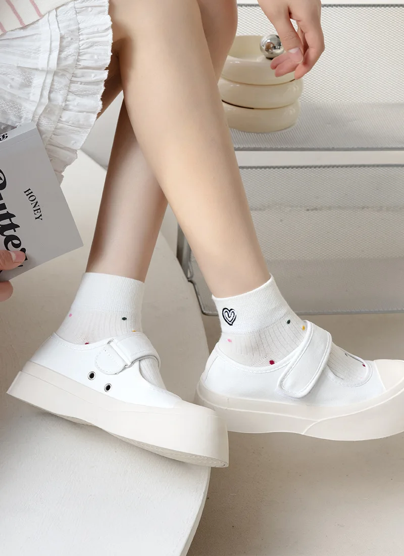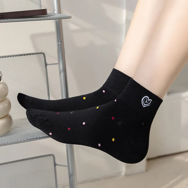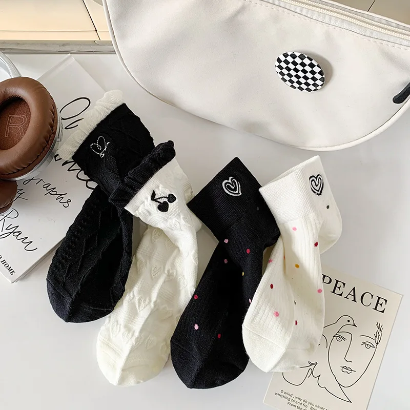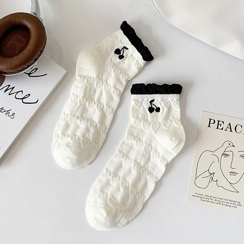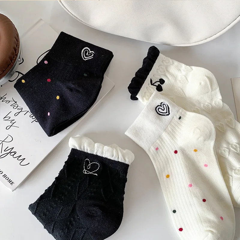 Lbsfy Women's Short Socks Spring Summer Love Cherry Embroidered Casual Cotton Low Tube Ruffle White Black Cute Kawaii Girl Cotton Sock