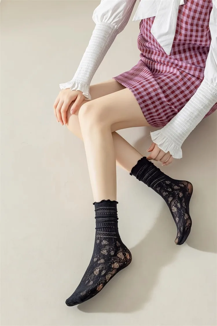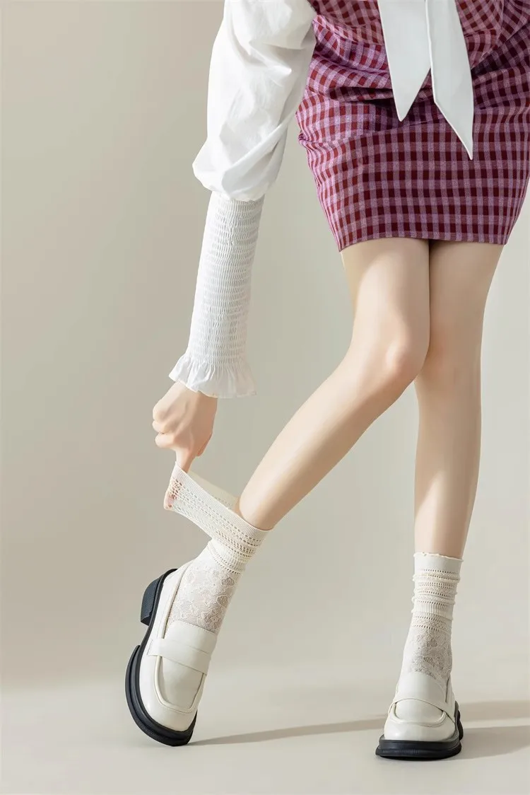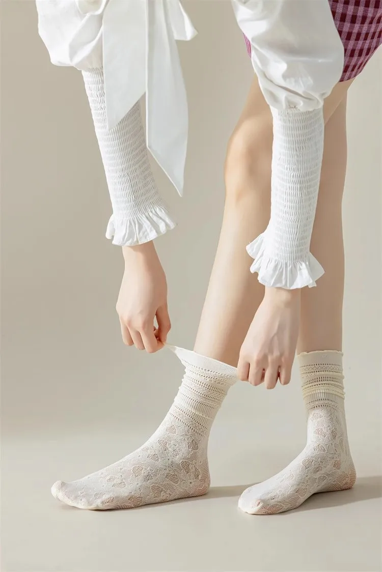 Lbsfy Women's Socks Spring Summer Solid Color Hollow Lace Sock Mid-tube Sock Breathable Lace Pile Sock Thin ballet-style Fashion Socks