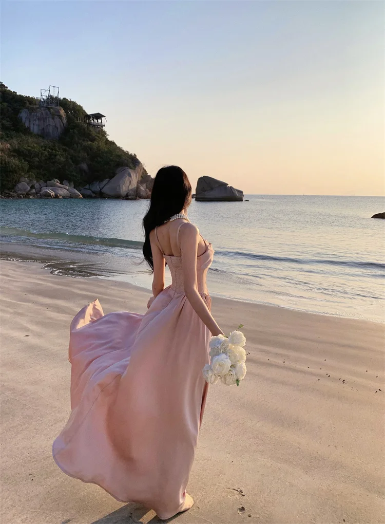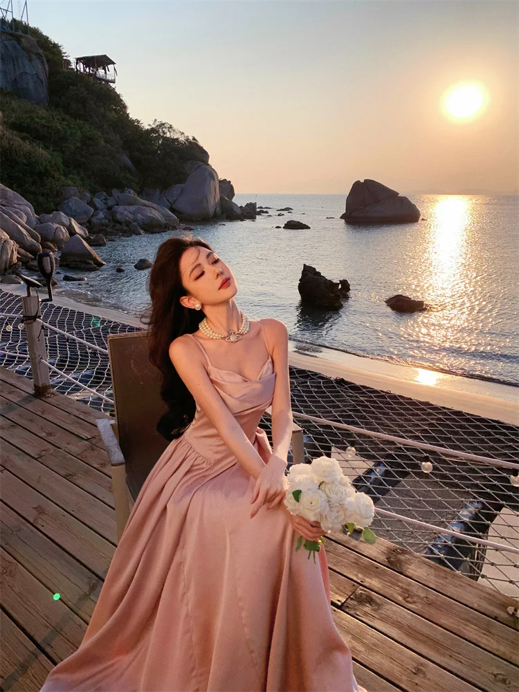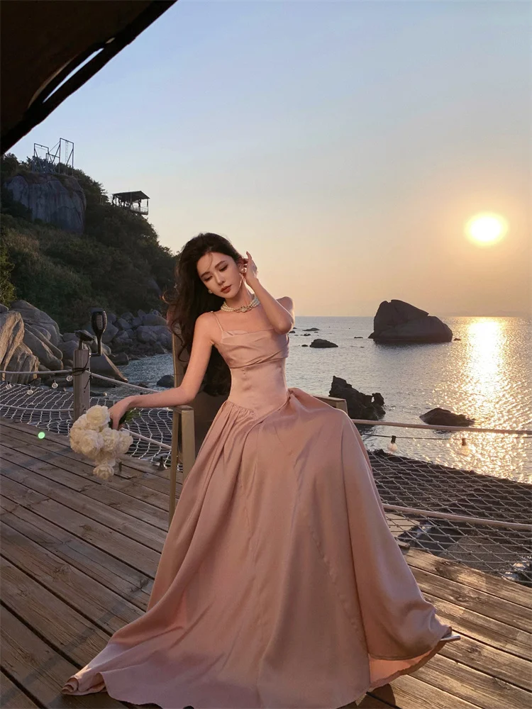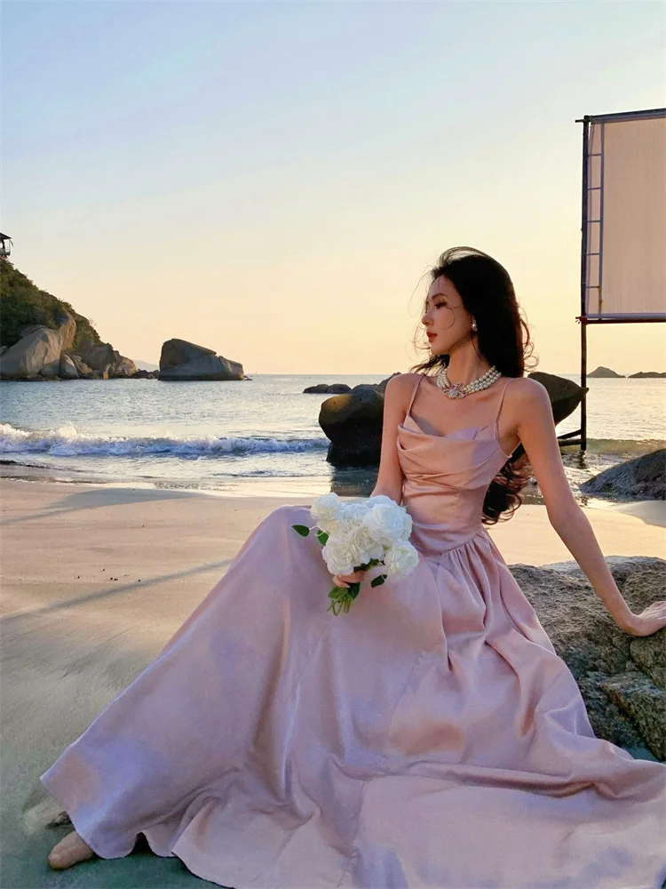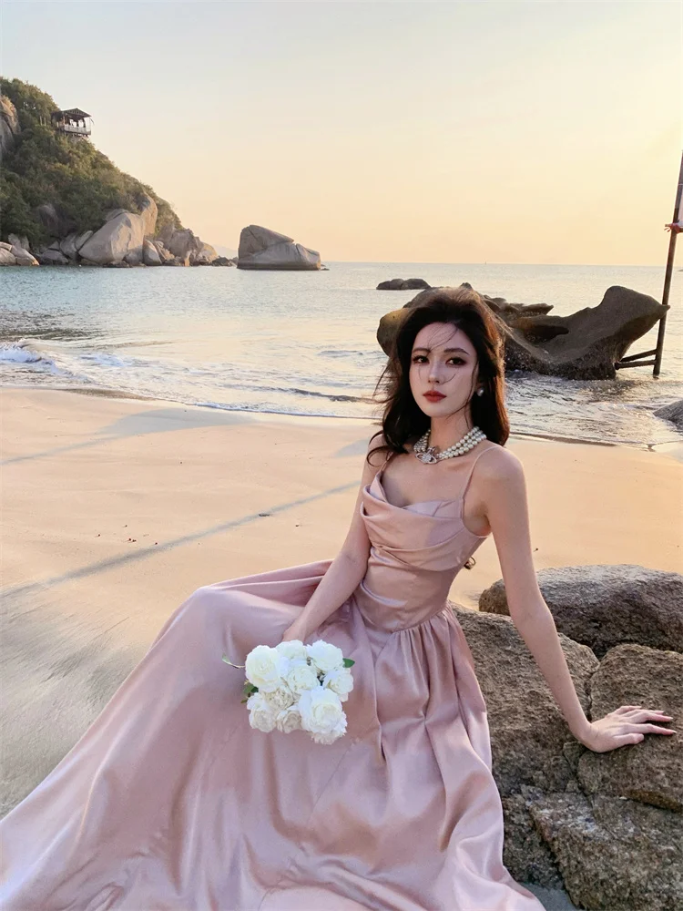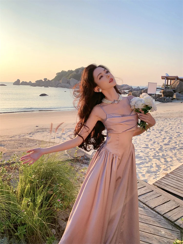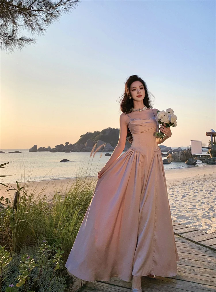LBSFY -Women's Vintage Elegant Party Dresses Summer Fashion 2025 New Solid Pleated A-Line Slim Sling Dress French Beach Holiday Vestido