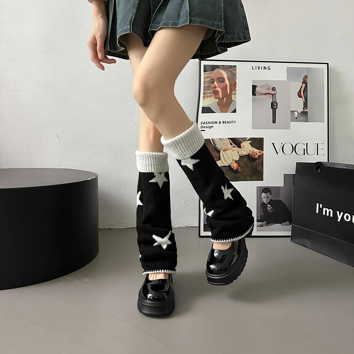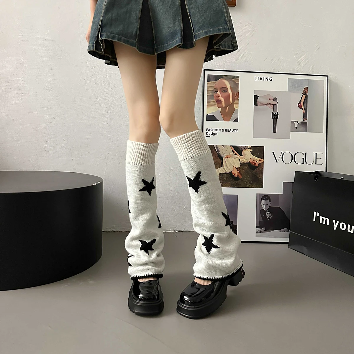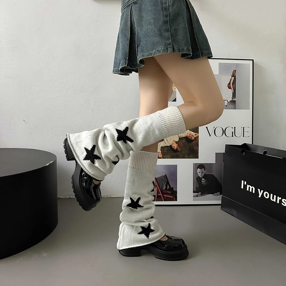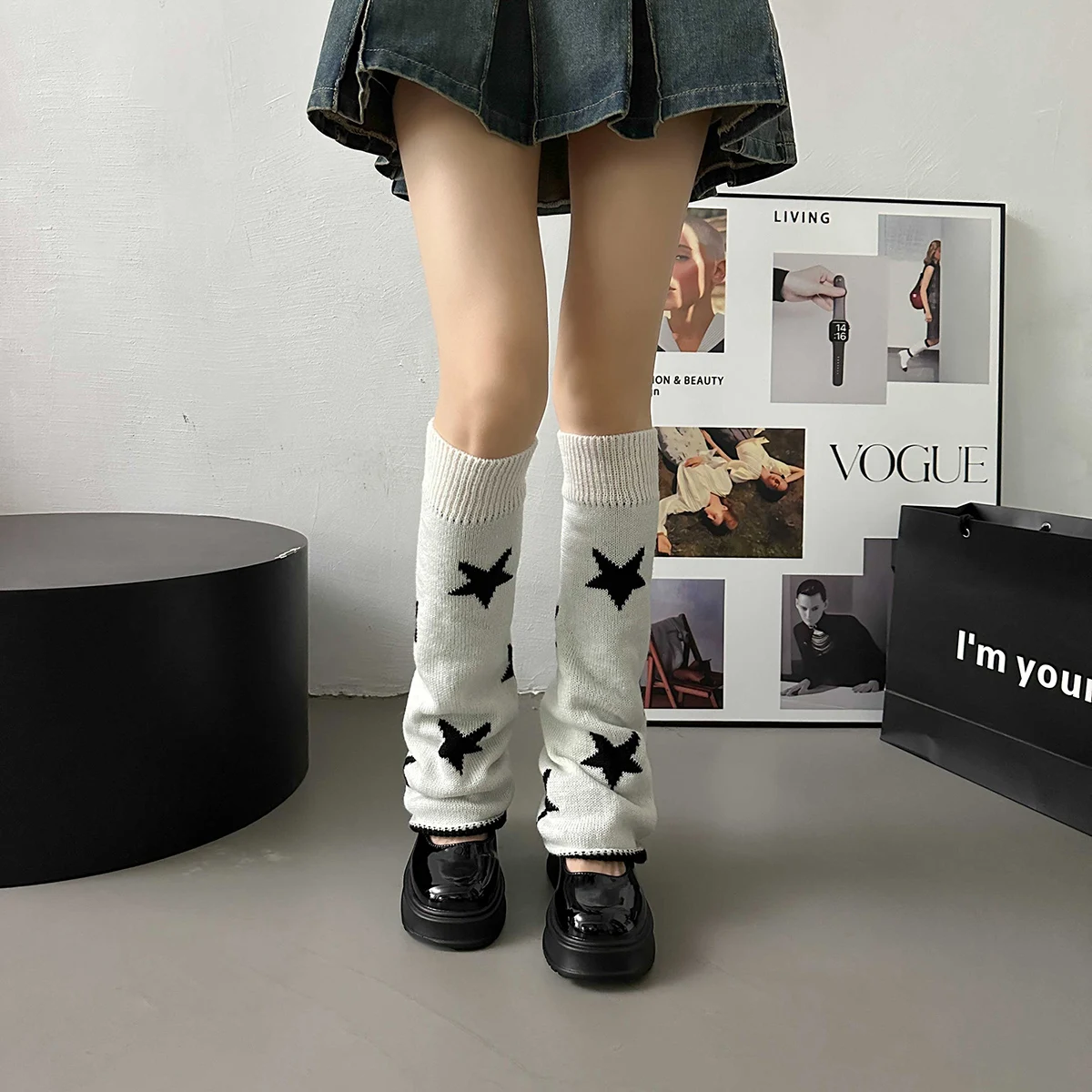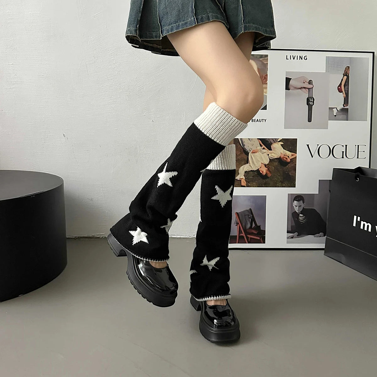 Lbsfy Y2k Star Pattern Knitted Leg Warmers Gothic Loose Leg Cover Sock Girls Winter Casual Leg Protector Stocking JK Thigh High Socks