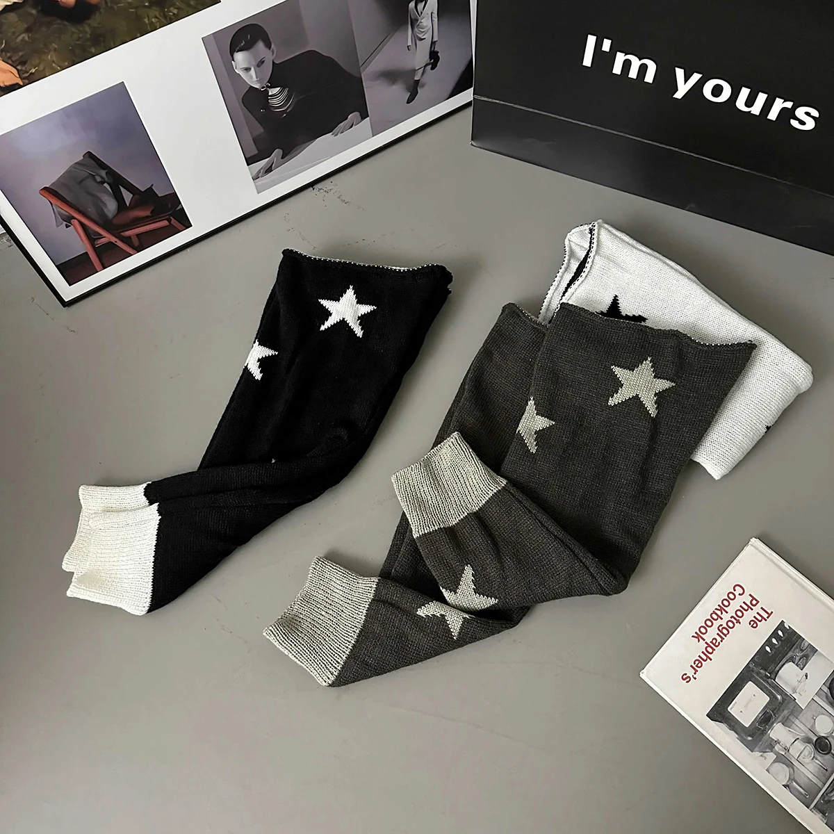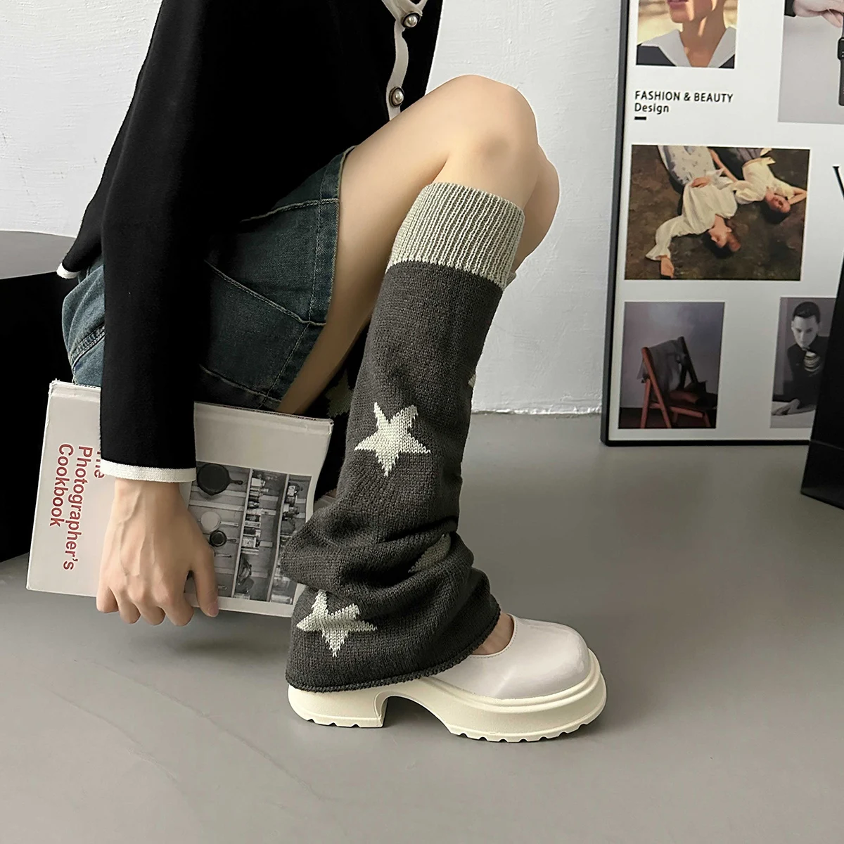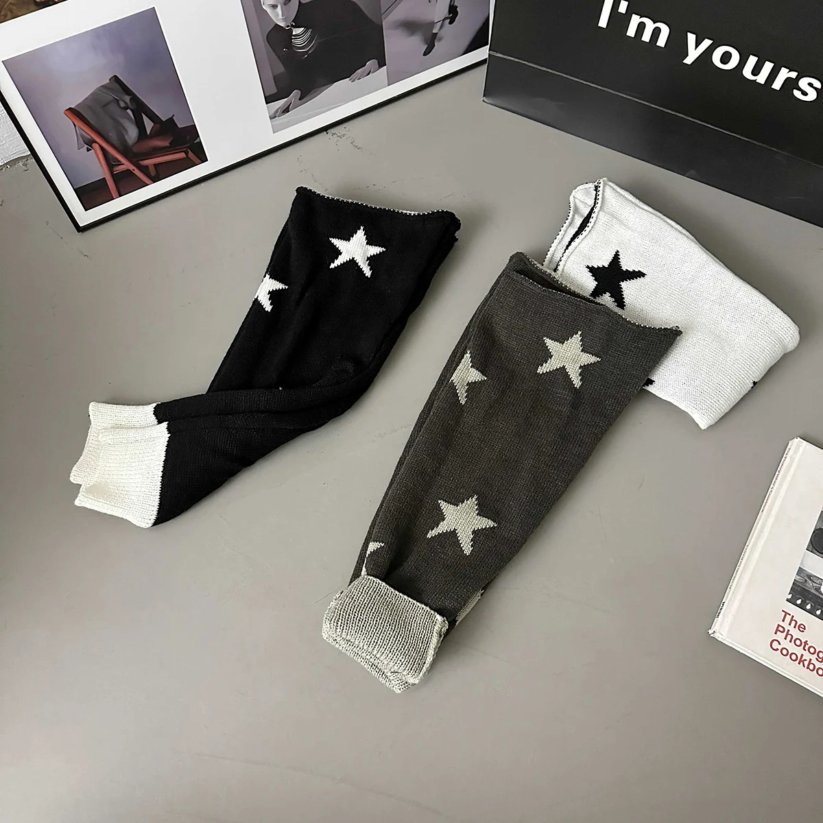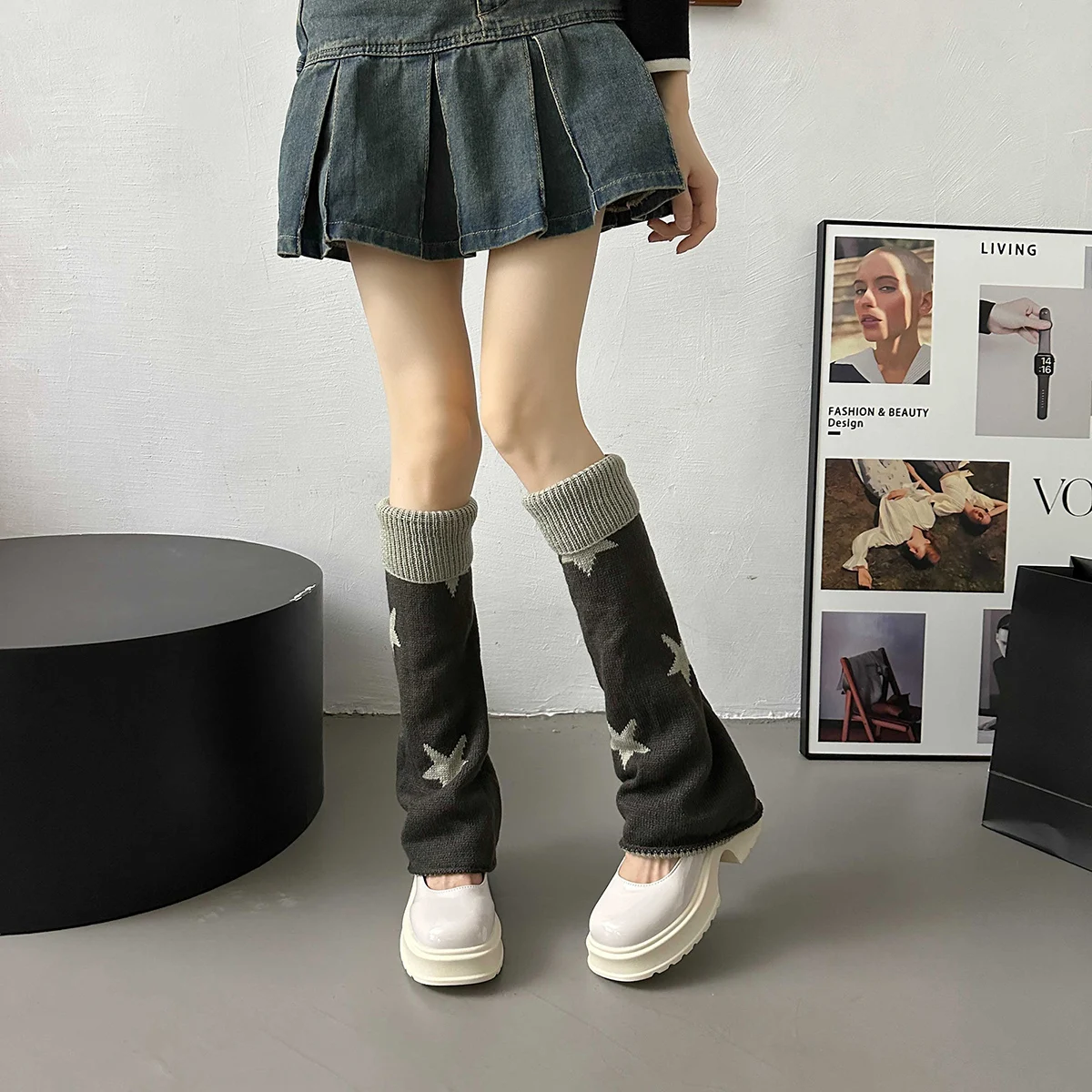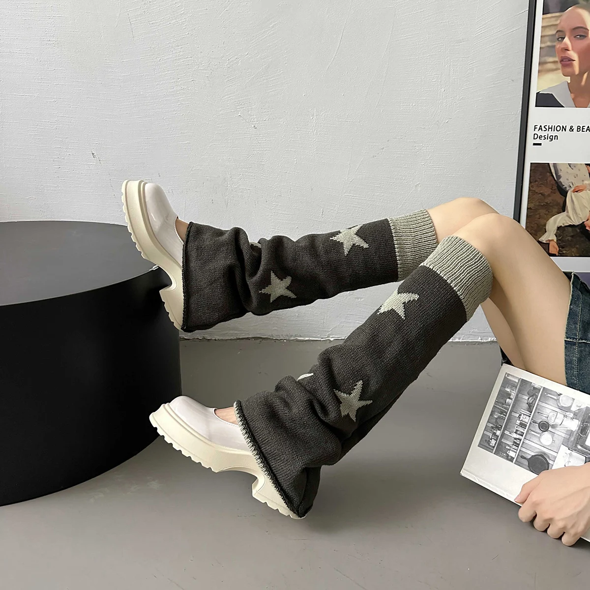 Lbsfy Y2k Star Pattern Knitted Leg Warmers Gothic Loose Leg Cover Sock Girls Winter Casual Leg Protector Stocking JK Thigh High Socks