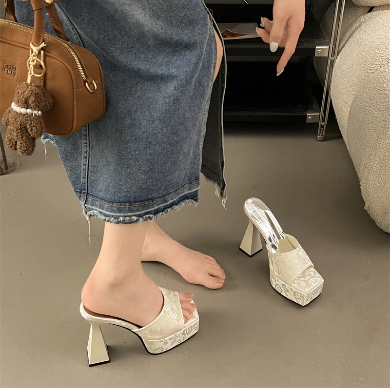 Summer Leopard Print Women Slippers Platform High Heels Party Club Shoes Ladies Elegant Square Toe Dress Slides